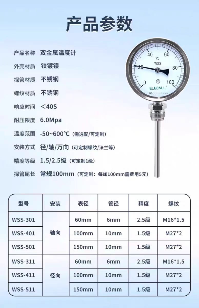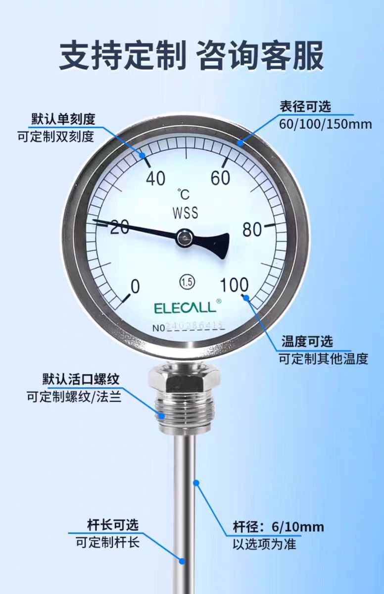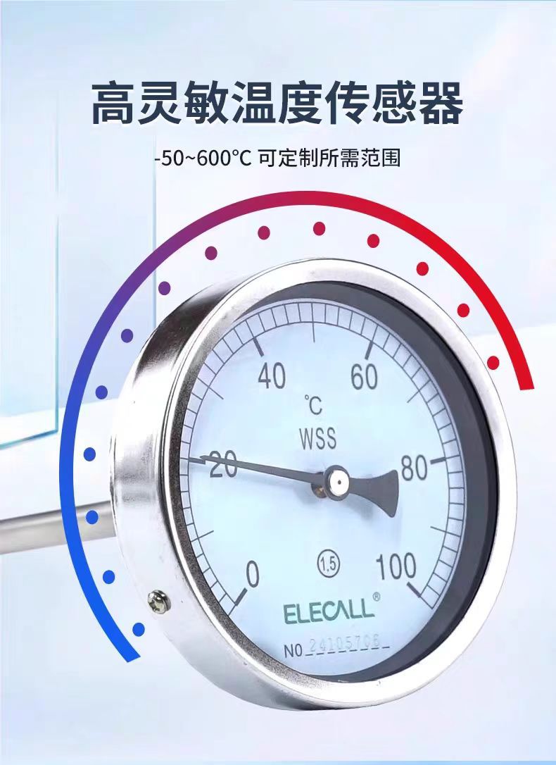 - What You Get: Includes one high-precision ELECALL WSS bimetal thermometer, offering a dependable solution for temperature monitoring with options for custom temperature ranges (-50 to 650℃) and probe lengths (30-3000mm) upon request.