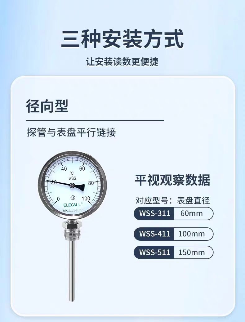 - Wide Compatibility: ELECALL WSS series bimetal thermometer is versatile, suitable for steam, gas, and liquid measurement in boiler systems, offering both axial and radial configurations to fit various installation needs.