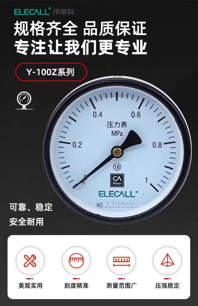 ELECALL Y-100Z Axial Pressure Gauge (0-1 MPa, M20*1.5 Thread) for Water, Oil, and Gas Measurement