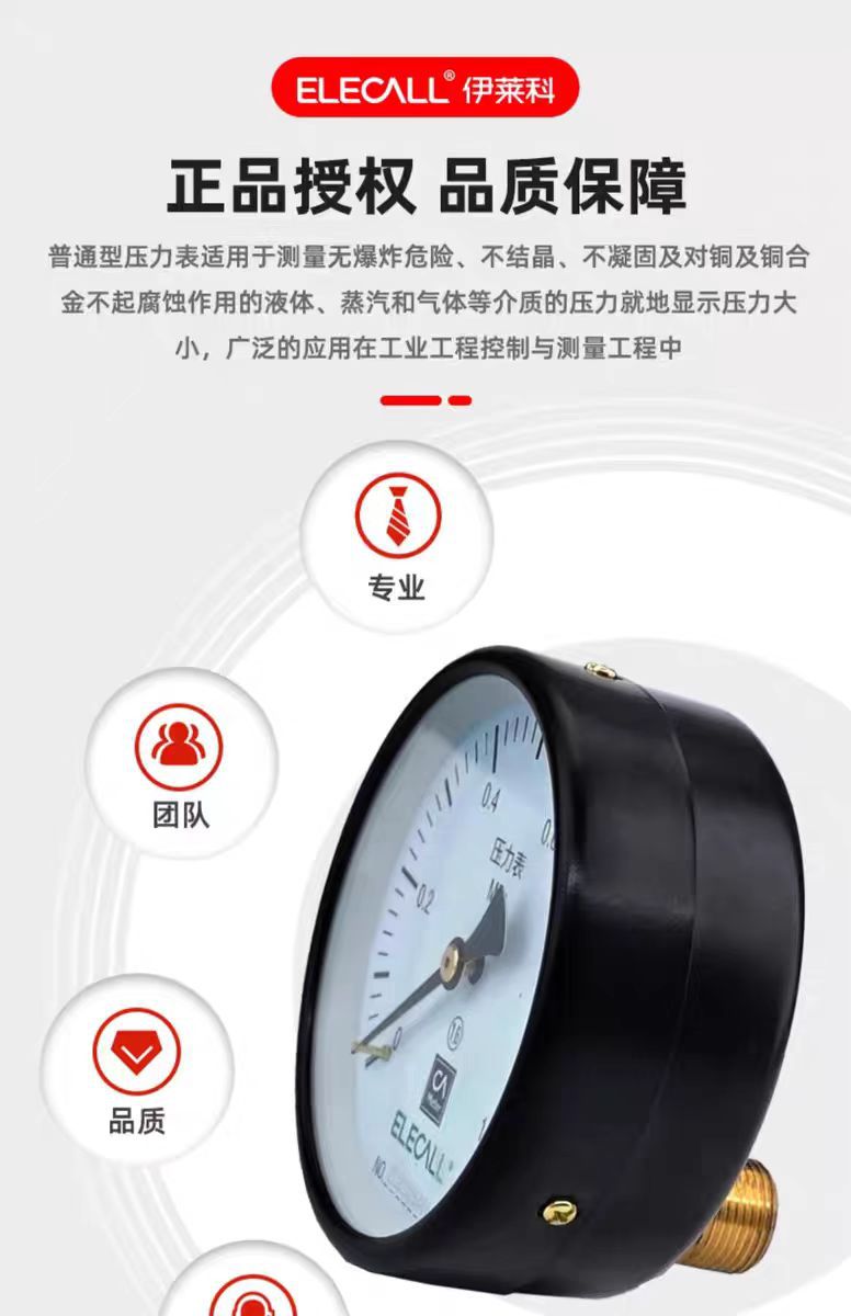 - Wide Compatibility: ELECALL Y-100Z axial pressure gauge suitable for measuring water, oil, and gas pressure in various applications, offering versatile use for industrial and domestic systems.