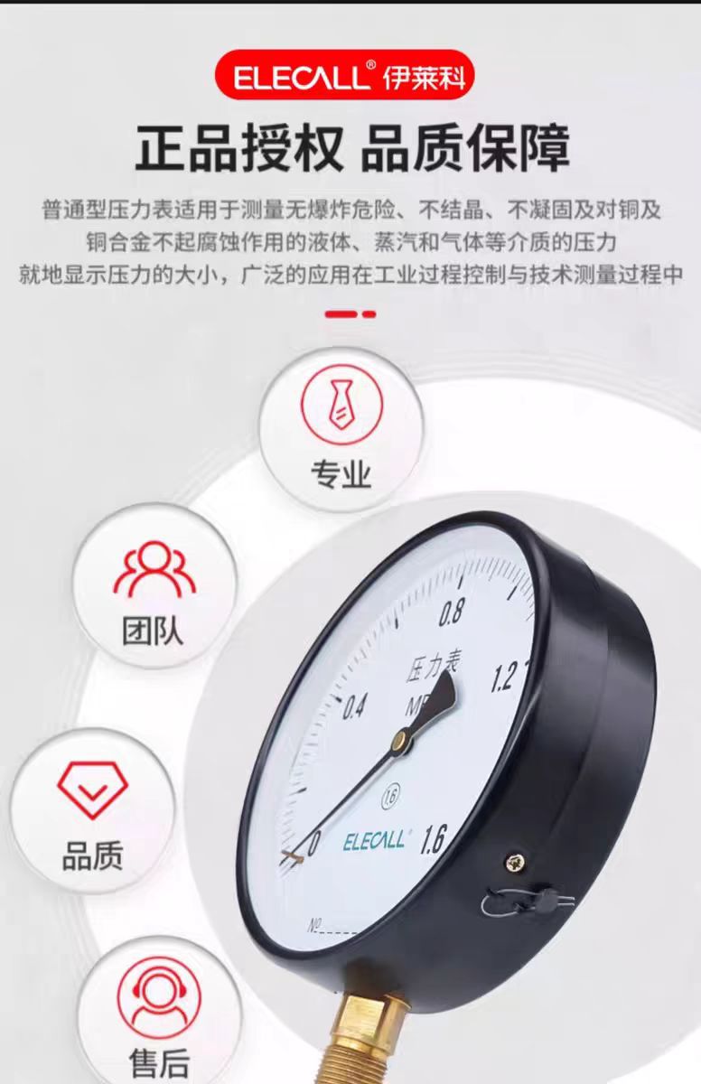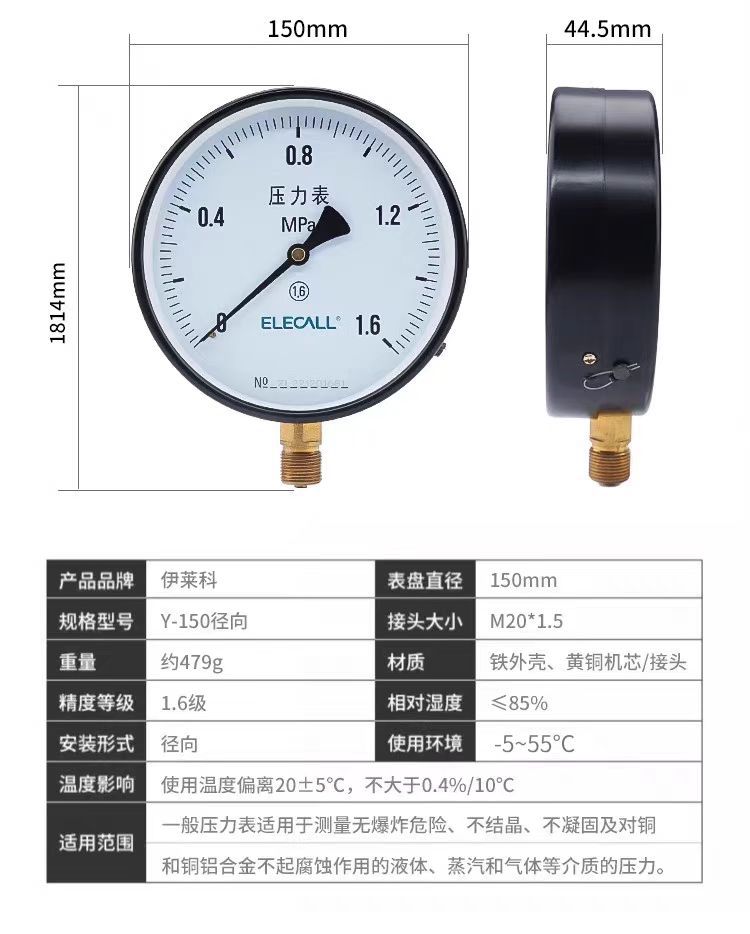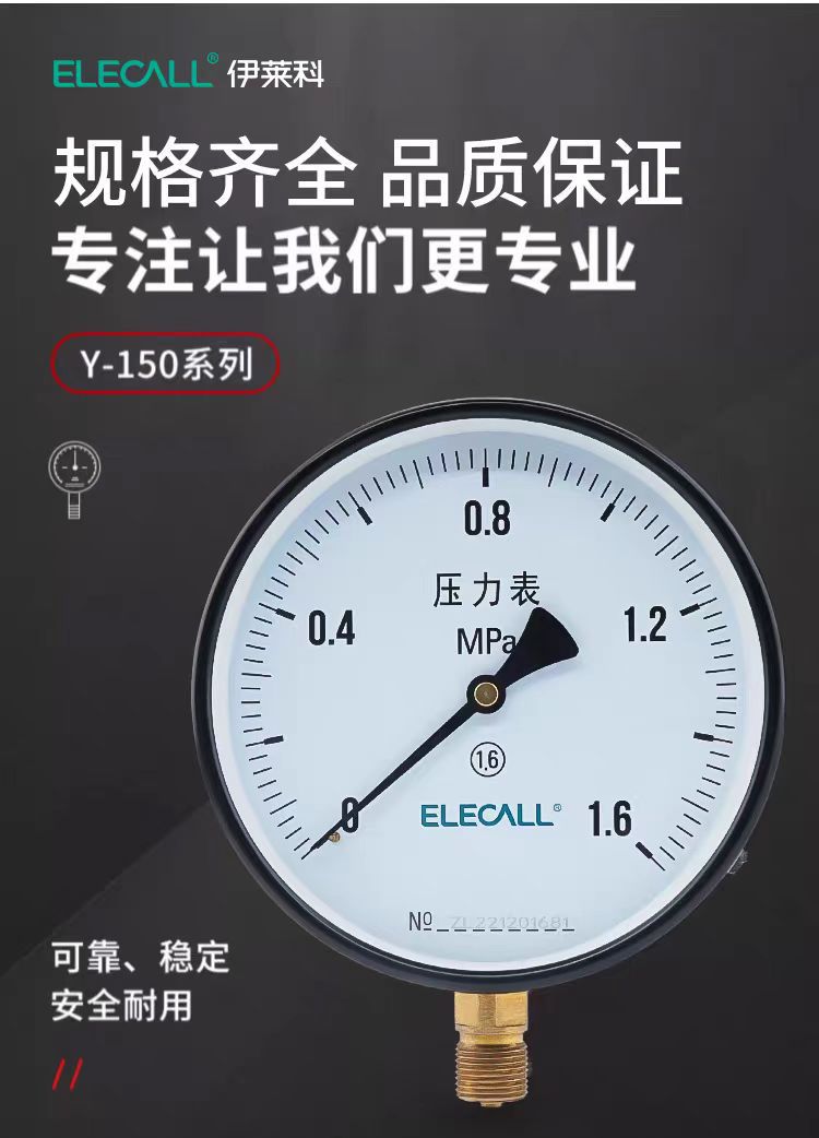 ELECALL Y-150 Radial Pressure Gauge (0-1.6MPa, 1.6 Accuracy) for Water, Oil, Air