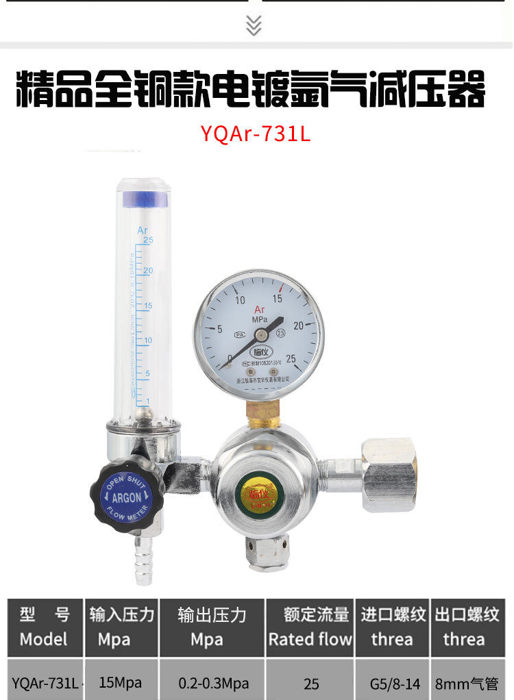 Full Copper Argon Gas Pressure Reducer YQAr-731L (0-15 MPa, 0-0.3 MPa Outlet, 15 L/min Flow) for Welding and Laboratory Use