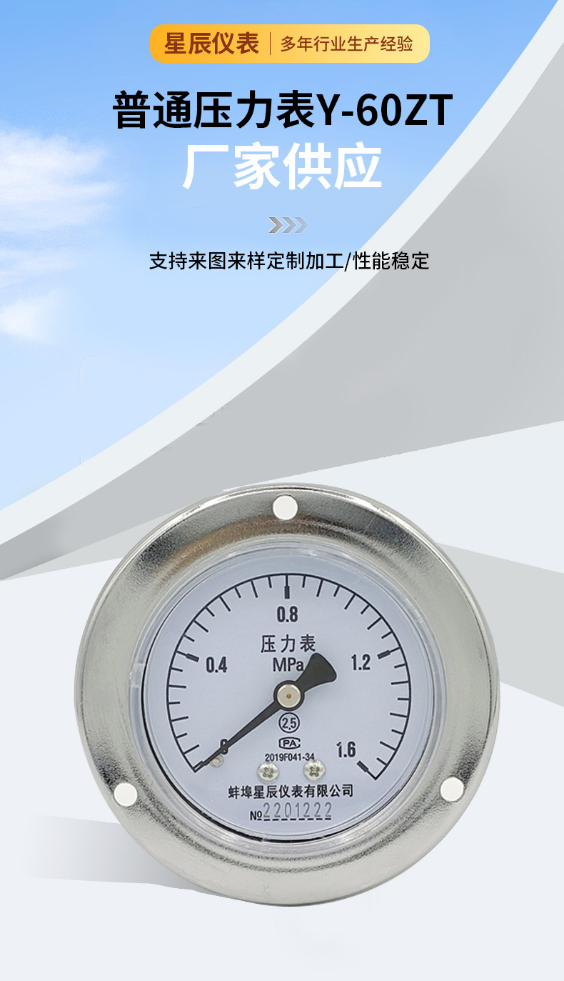 General Pressure Gauge Y-60ZT (0-1.6MPa, 60mm Axial) for Water, Air, Oil, Hydraulic Systems