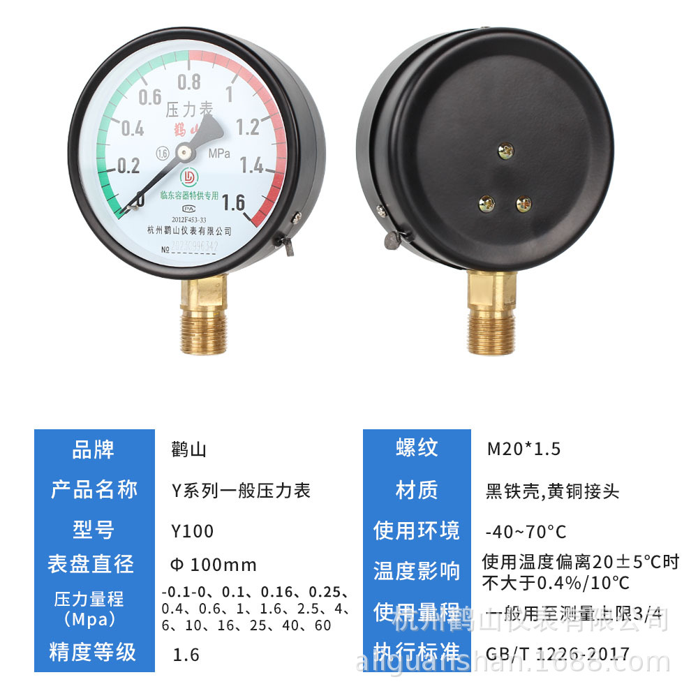 - Key Specs & Performance: Y100 model with a 0-1.6 MPa measurement range, 100mm nominal diameter, and 1.6 accuracy class for precise and easy-to-read pressure indications.