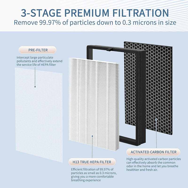 - Quality Material: Features a multi-layer filtration system including a true HEPA filter and activated carbon layer, effectively capturing ultrafine particles and odors.