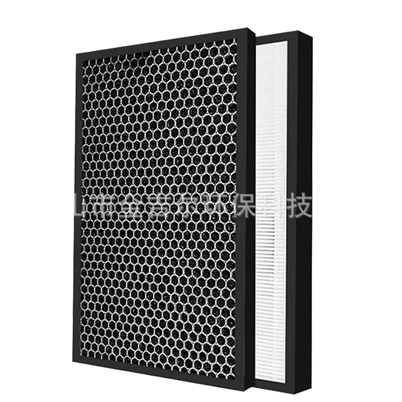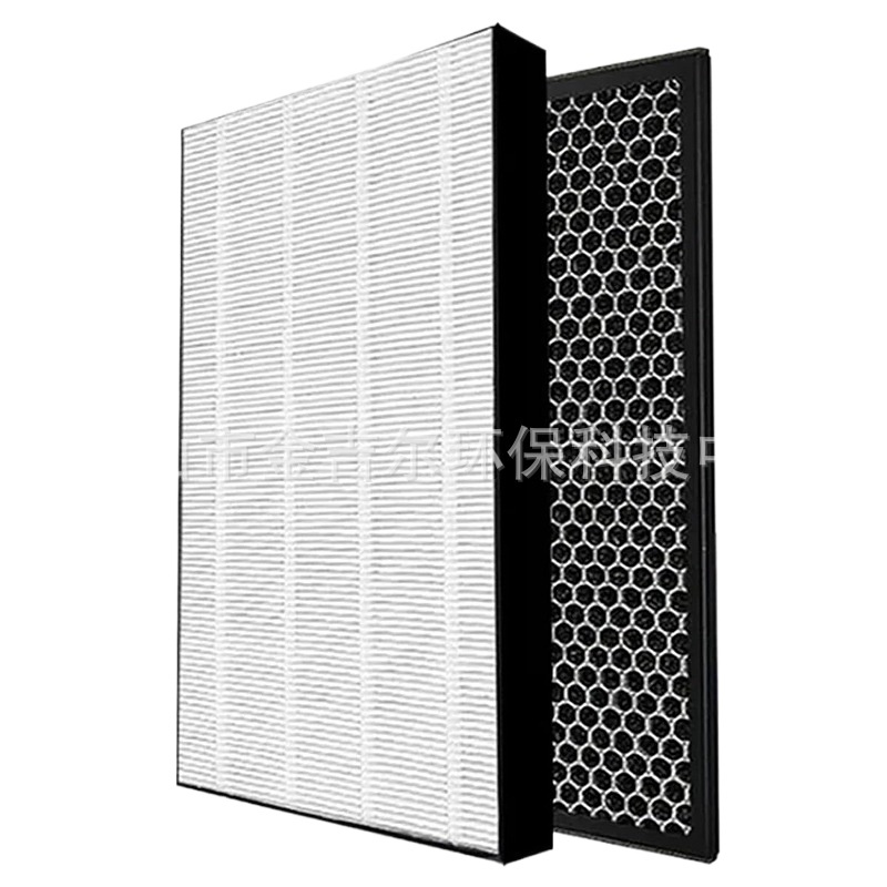 - Premium Filtration: Features a multi-layered design with a high-efficiency HEPA filter (white, pleated) for trapping fine particles down to 0.3 microns, and an activated carbon filter (black, honeycomb structure) for absorbing odors and harmful gases.