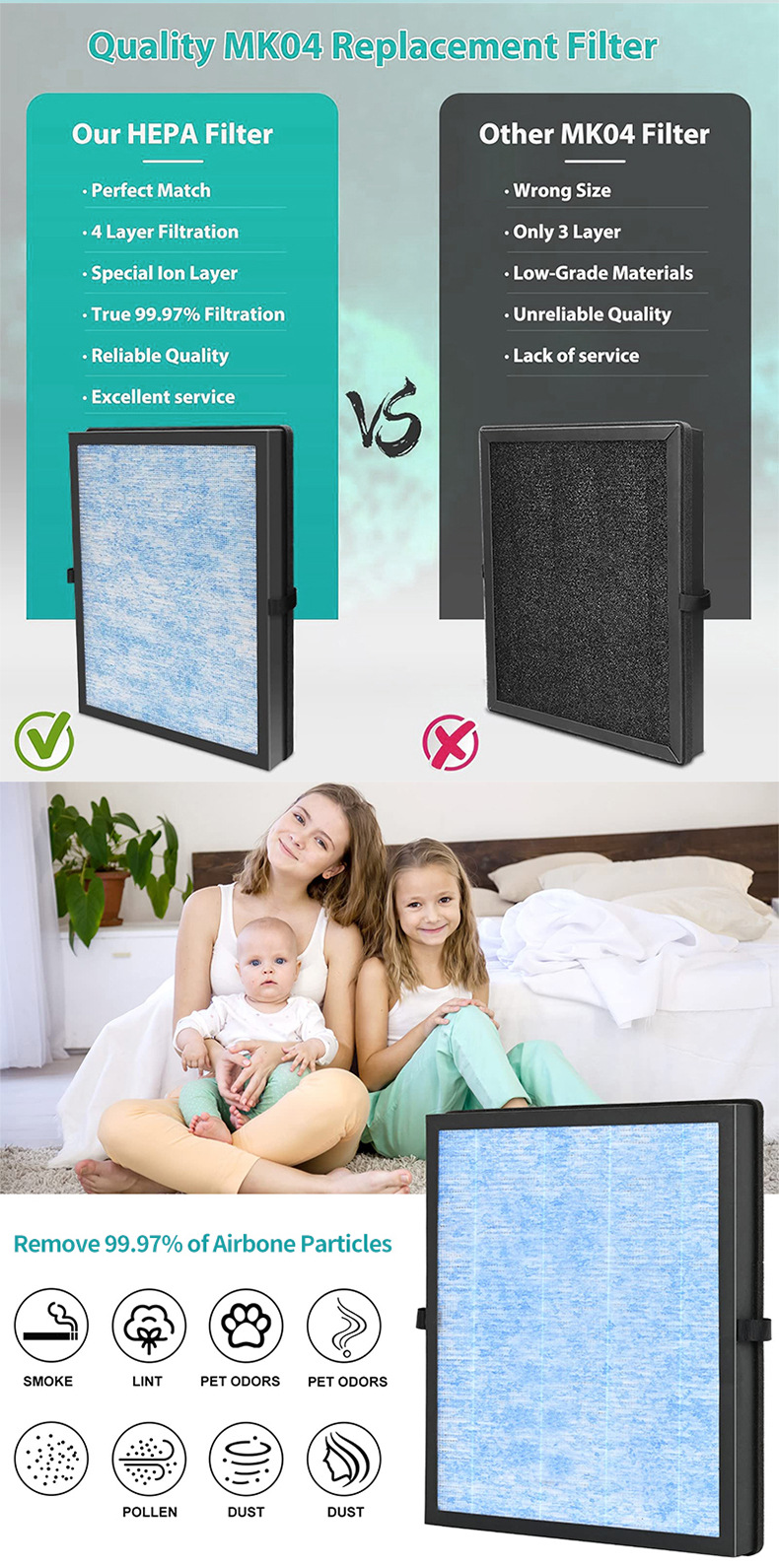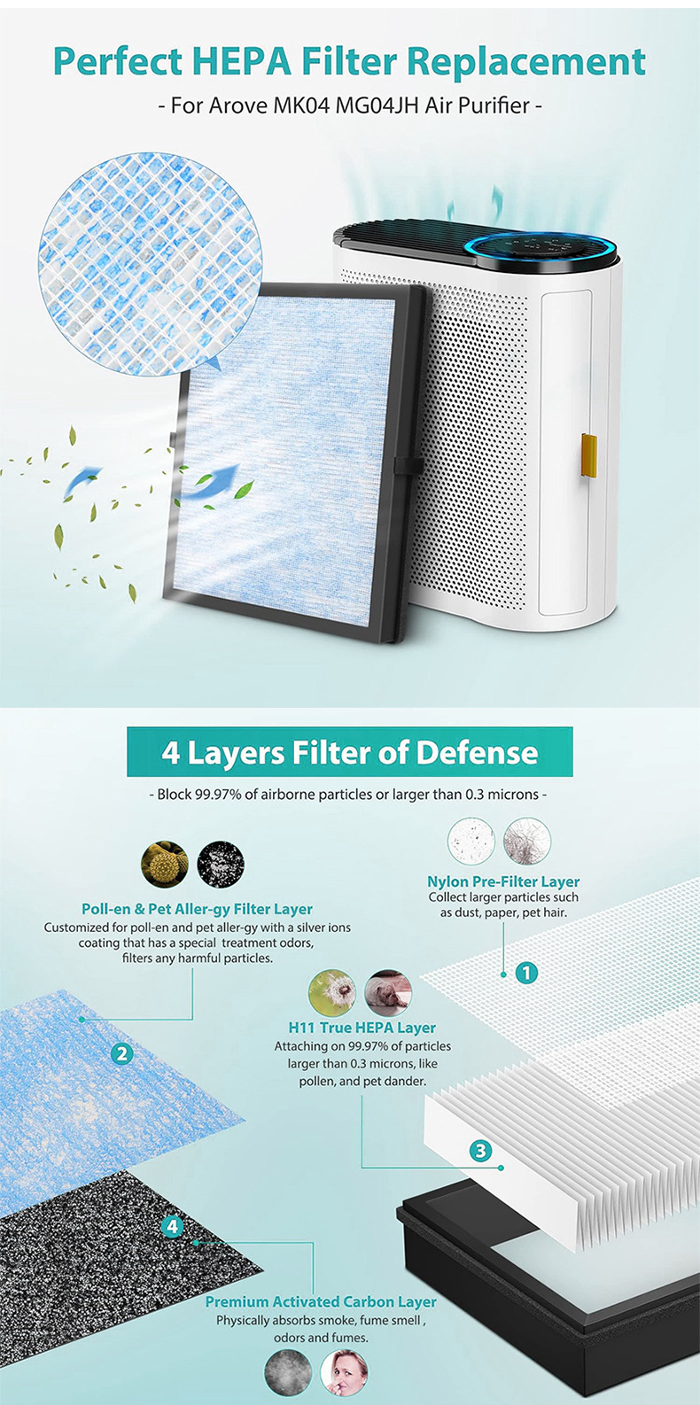 - Wide Compatibility: Designed to perfectly fit AROEVE MK04, MG04JH, and DH-JH04 air purifiers, directly replacing the DH-JH04 filter.