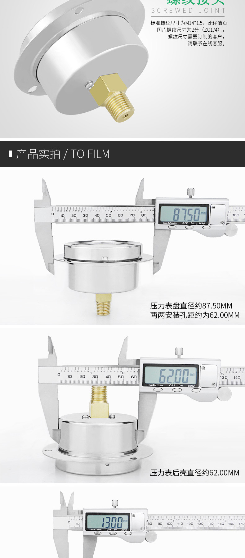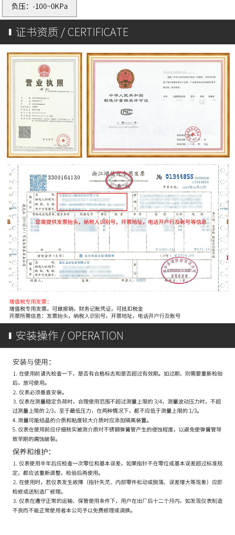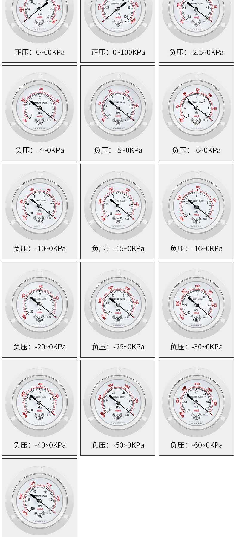 - Core Specifications: Features a measurement range of -100 to 100 KPa with a 2.5 accuracy grade. Its 60mm nominal diameter and M14*1.5 or ZG1/4 connection type make it versatile for different pressure measurement needs.