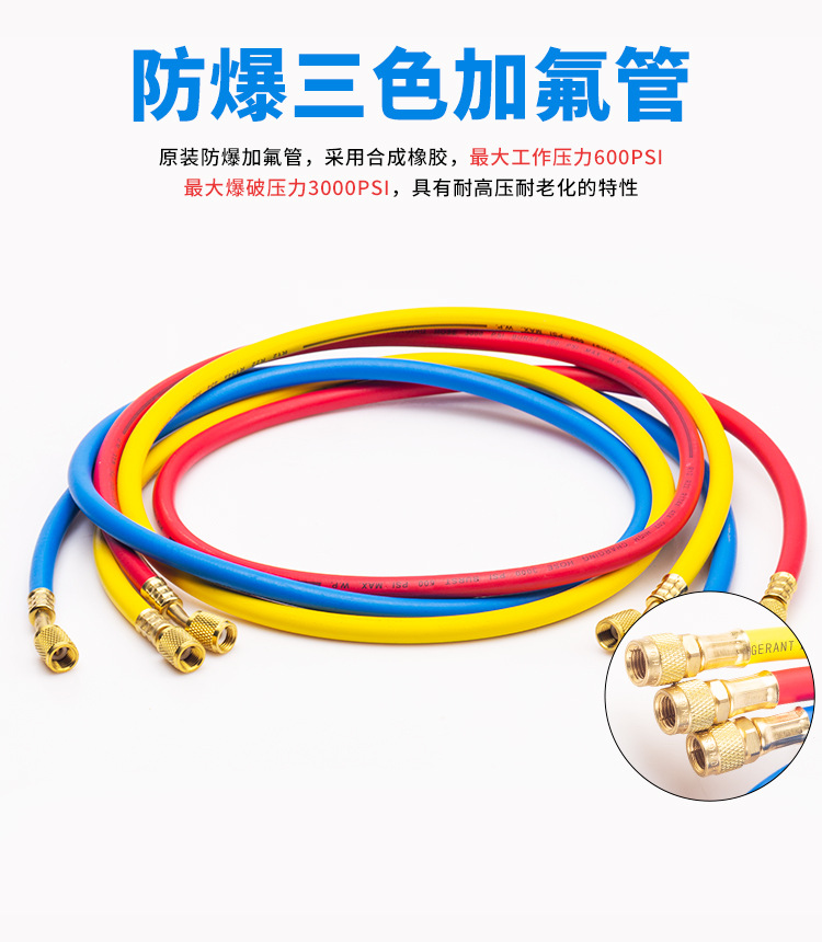 - Easy Installation: Comes as a complete kit with color-coded hoses (red, blue, yellow) and quick-connect adapters (blue and red), facilitating straightforward and secure connections.
