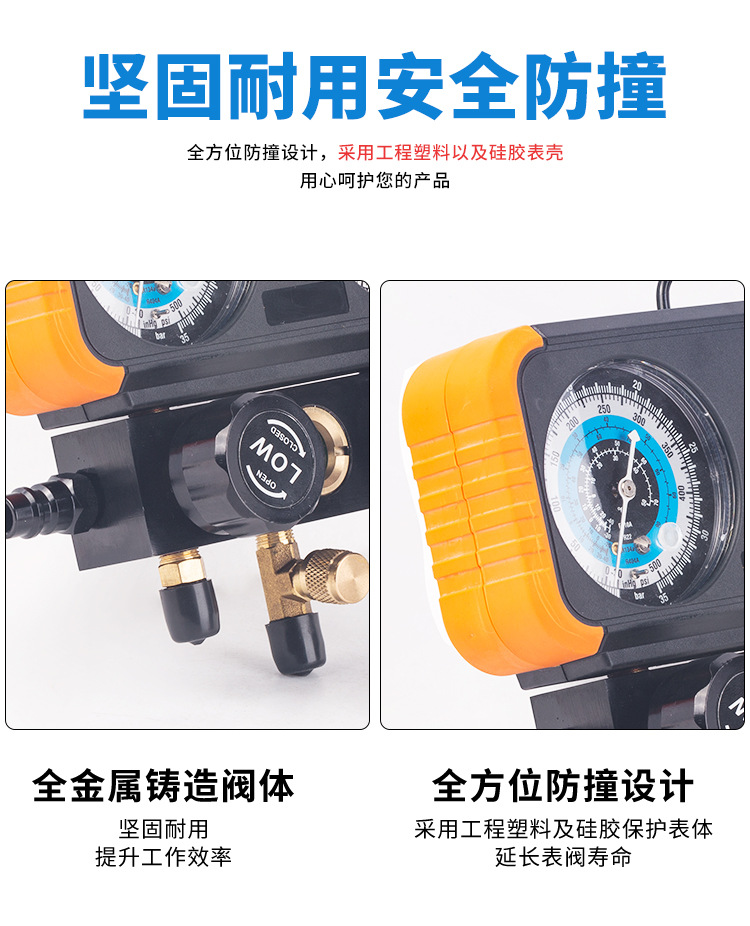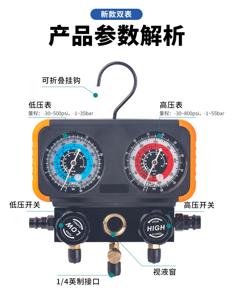 - Key Specs & Performance: Equipped with clear dual pressure gauges (LOW/HIGH) for accurate readings, essential for precise charging and diagnostics of HVAC/AC units.