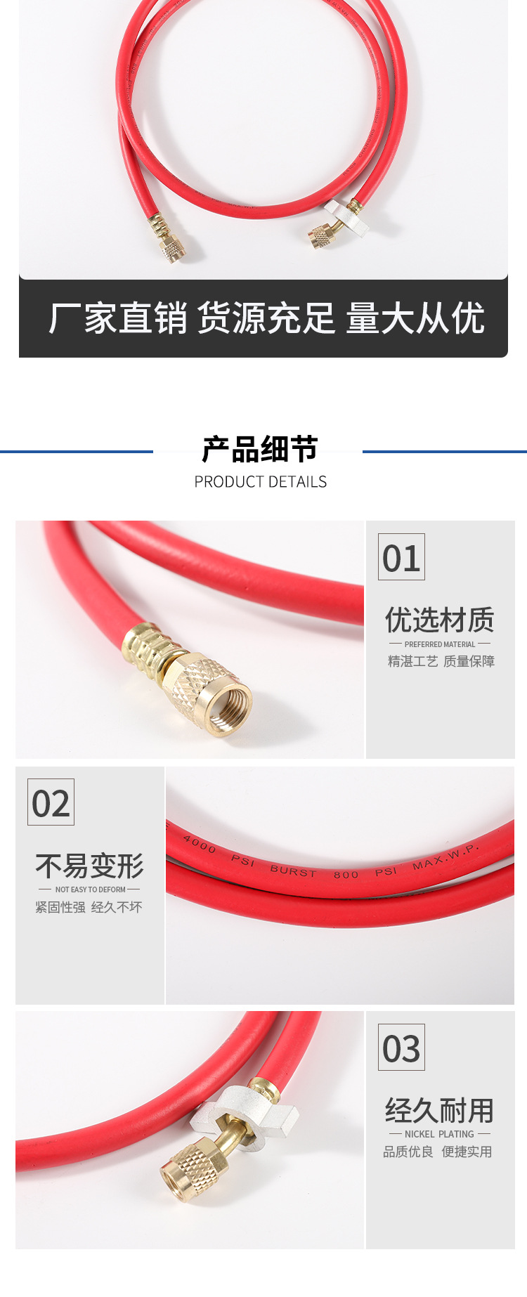 - Key Specs & Performance: Each hose is rated to withstand pressures up to 70 kgf (approximately 1000 PSI Working Pressure, 4000 PSI Burst Pressure) for safe and efficient refrigerant charging and recovery.