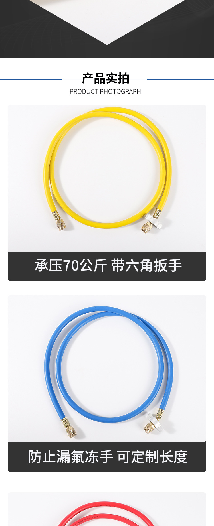 - Wide Compatibility: Universal refrigerant charging hoses designed for R22, R410a, R134, and R404a systems, featuring explosion-proof high pressure resistance and suitable for various HVAC refrigeration applications.