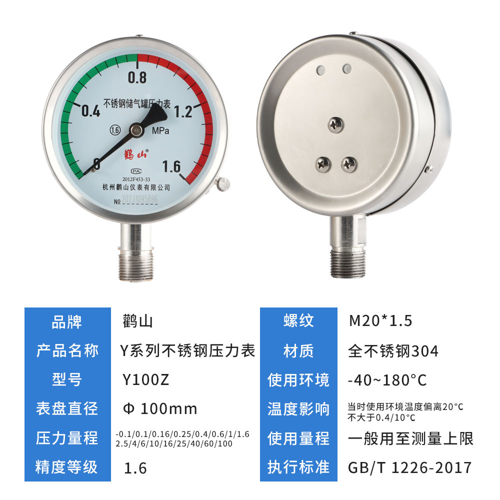 HongShan Y100BF Stainless Steel Pressure Gauge 1.6 MPa (0-1.6 MPa) For Air Storage Tanks, Corrosion-Resistant Pressure Measurement