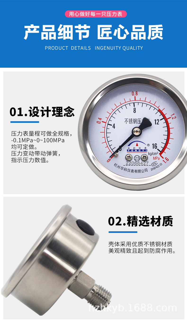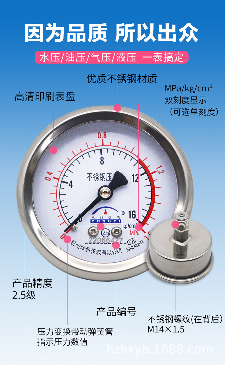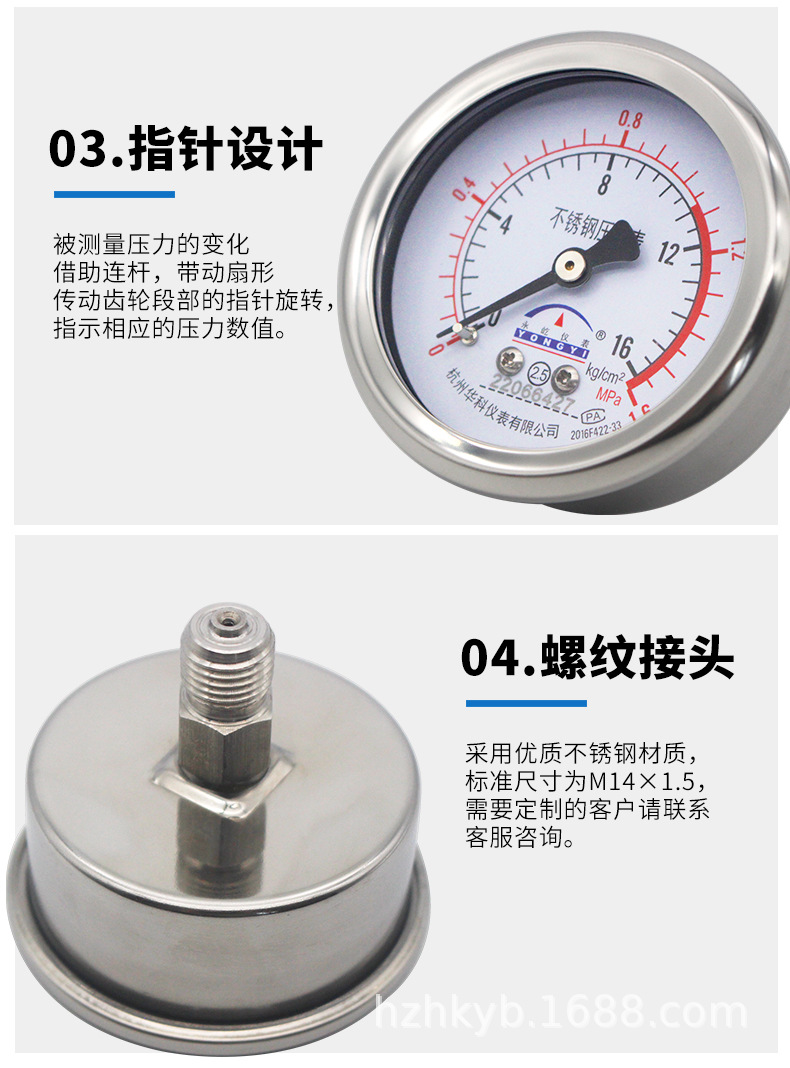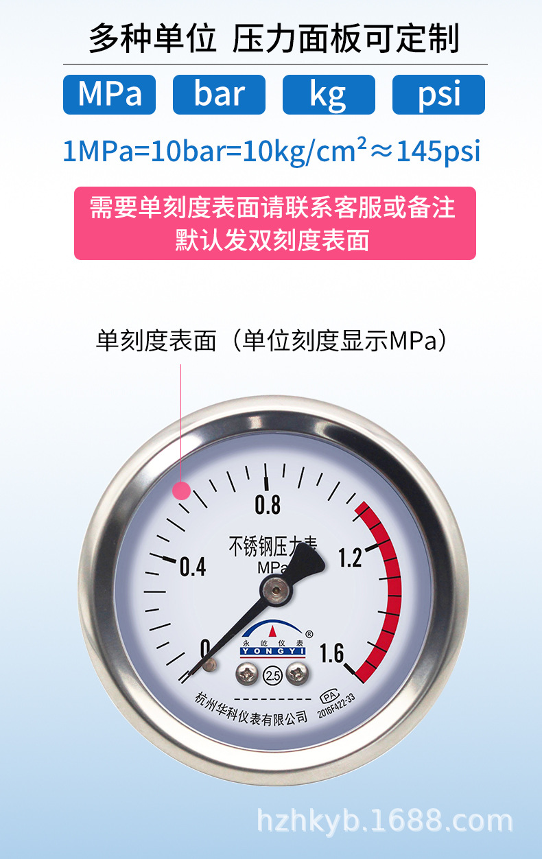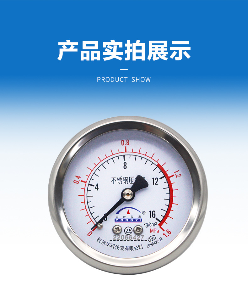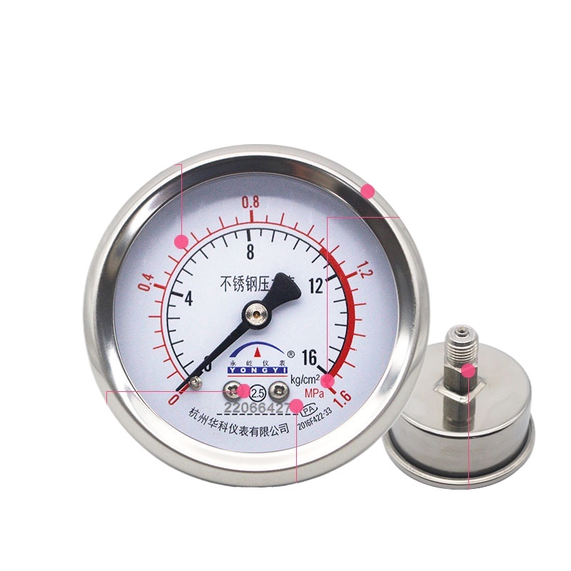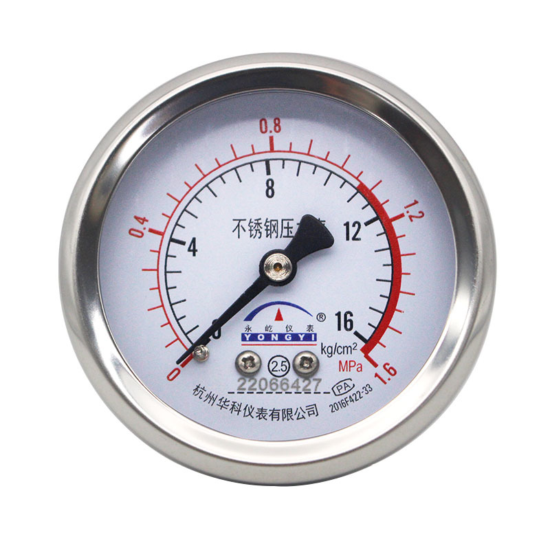 Hongke Yongyi Y60ZBF Axial Stainless Steel Pressure Gauge Water Oil Gas Manometer 0-1.6MPa 60mm Dial