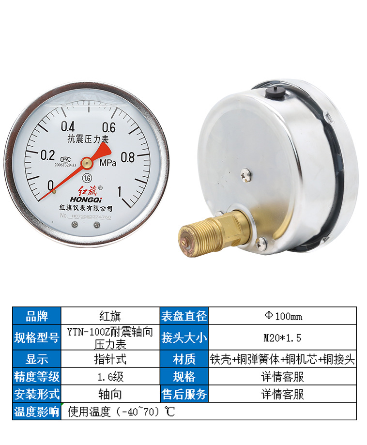 - Durable Construction: Hongqi YTN-100Z pressure gauge features a robust shock-resistant design, ensuring stable and accurate readings even in demanding environments.
