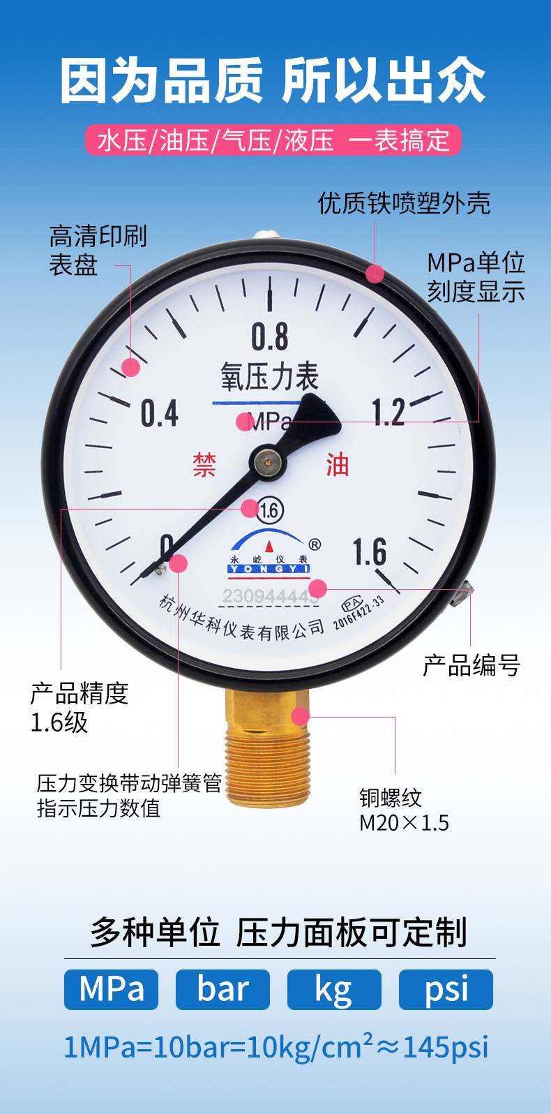 - Key Specs & Performance: Features a 100mm nominal diameter dial with a measurement range shown up to 1.6 MPa (scalable based on available options), ensuring precise readings (Accuracy Class 1.6) for various oxygen and other fluid pressure applications.
