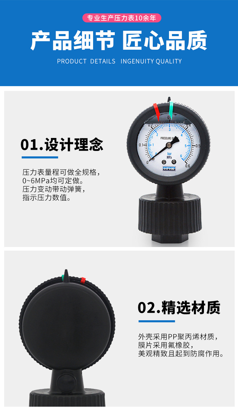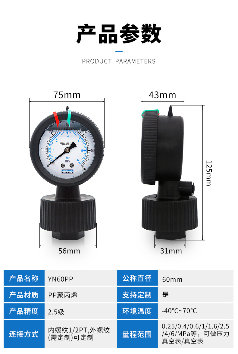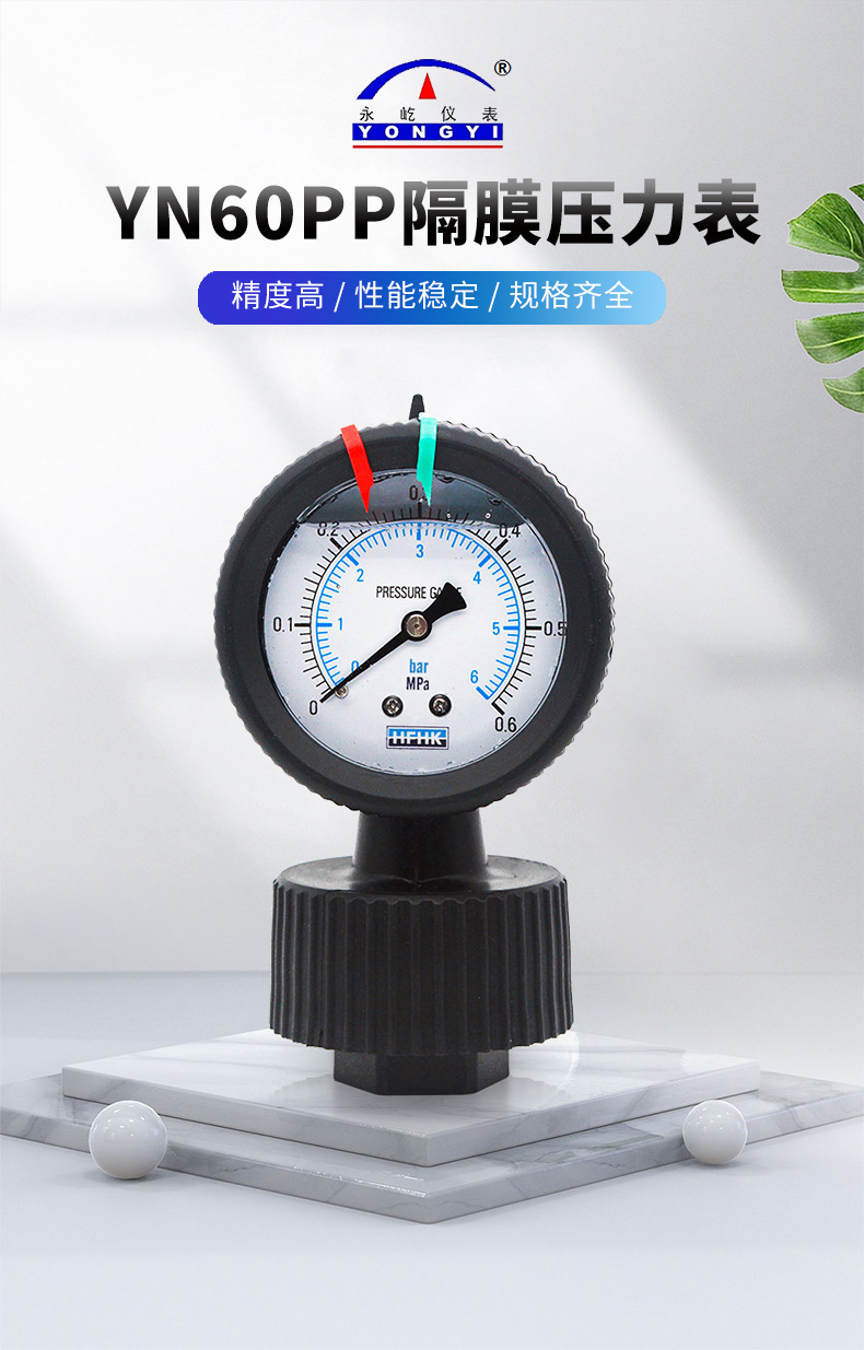 Huake Yonyi YN60PP Radial PP Diaphragm Pressure Gauge (0.6MPa, 60mm Diameter) for Water, Liquid, Oil, Gas Systems