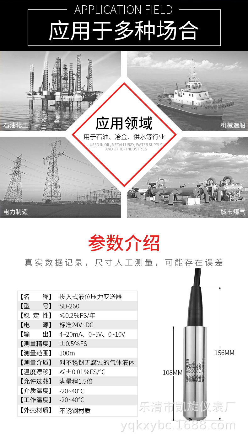- Compatibility: Universal design suitable for various applications requiring precise liquid, gas, or oil pressure measurement with 4-20mA output. Model SD-802, 24VDC power supply.