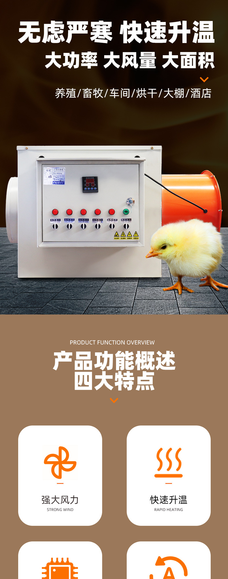 - Key Specs & Performance: Features constant temperature control, rapid heating, and anti-dry burning protection, delivering efficient and safe warmth for livestock farms, workshops, and greenhouses.