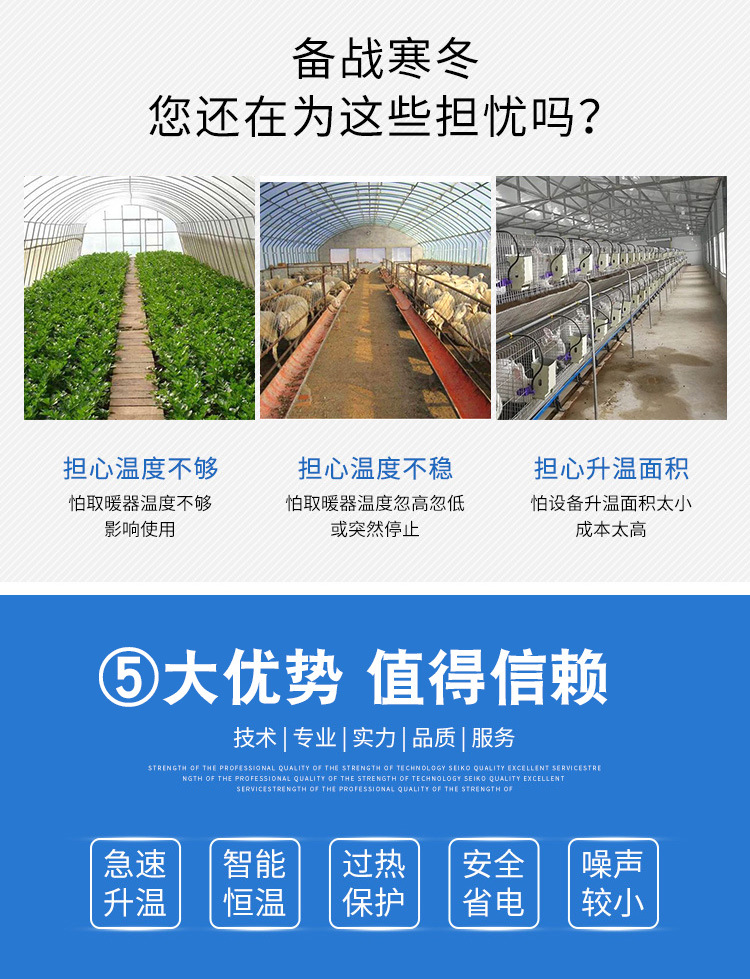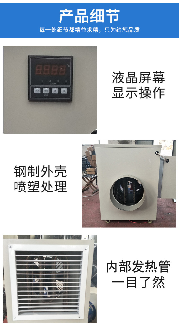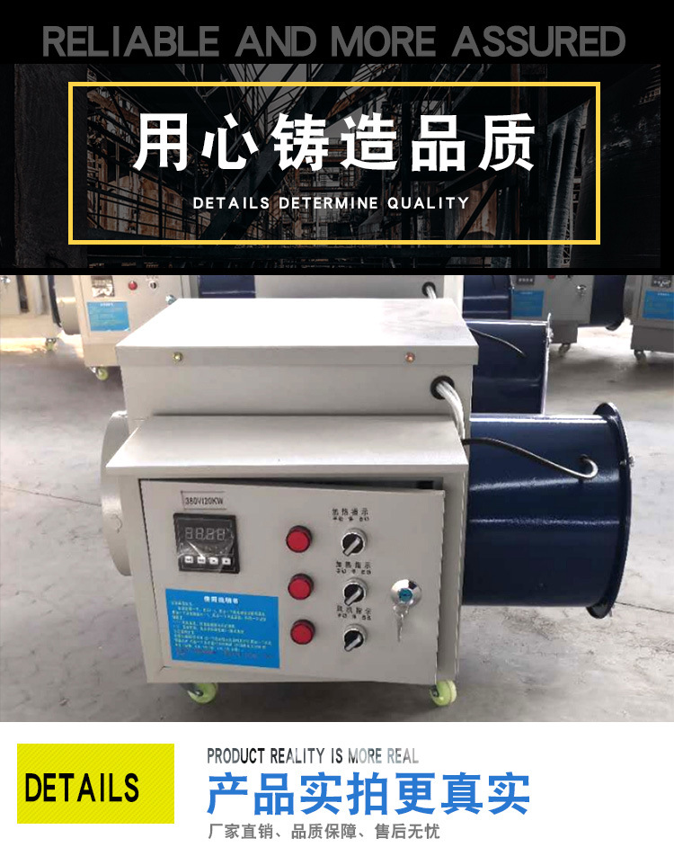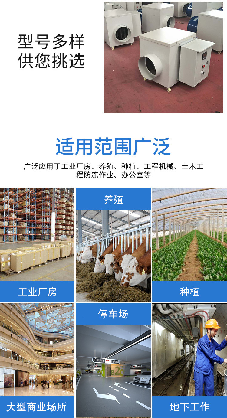 - Wide Compatibility: Designed for versatile use in workshops, construction sites, pigsties, poultry houses, and greenhouses, providing efficient heating for large areas with multiple power options from 5KW to 50KW.