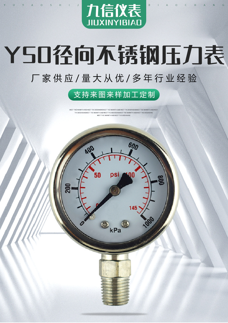 Industrial Stainless Steel Pressure Gauge (0-1000 kPa/0-145 psi) Y50 Radial Connection for Oil, Gas, Liquid, Water Systems
