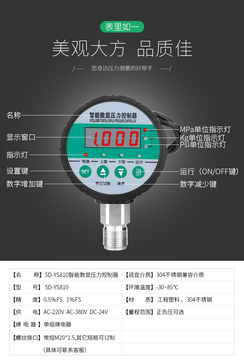 - Wide Compatibility: SD-YS810 intelligent digital pressure controller is suitable for water and hydraulic pressure systems, offering robust performance across various applications.