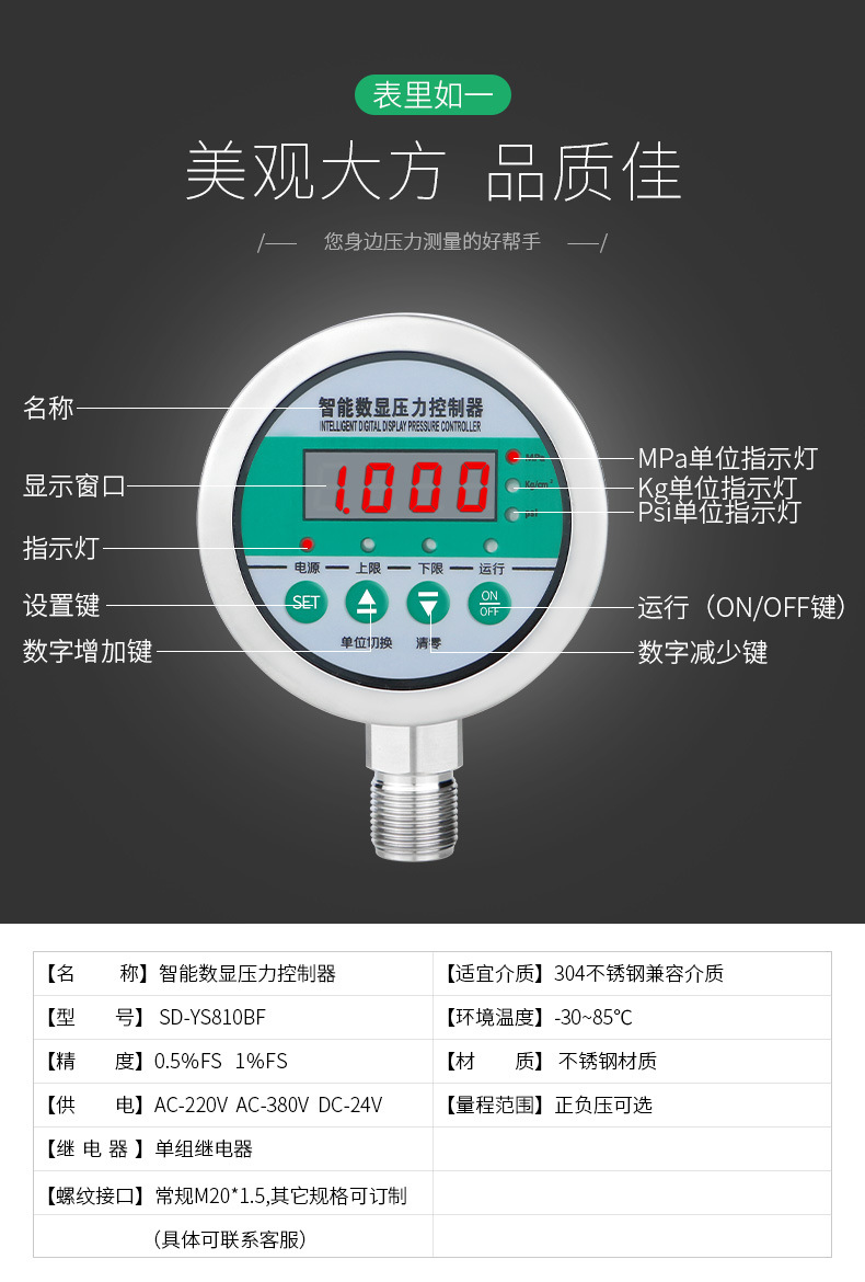 - What You Get: One SD-YS810BF intelligent digital display pressure controller, ensuring precise pressure measurement and control for your systems. Backed by factory support for customization.