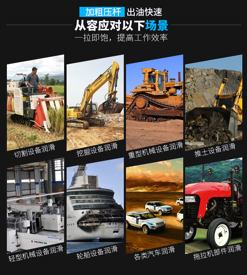 - Key Specs & Performance: Features a high extrusion pressure of 10000-13000psi and working pressure of 10000-13000psi, allowing for efficient and powerful lubrication. Available in 600CC, 800CC, and 900CC capacities.