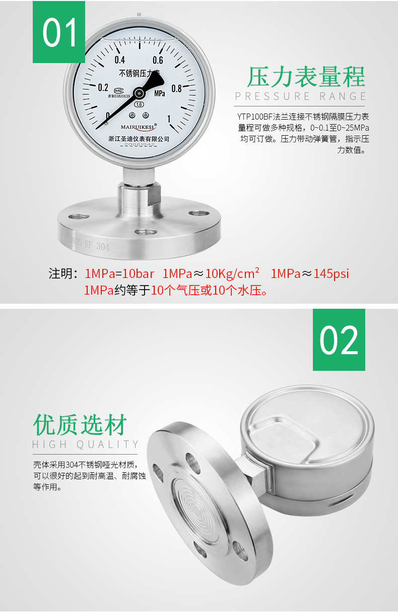 MAIRUIKESI YTP100BF Diaphragm Pressure Gauge with Flange Connection DN25-DN100, 316L Stainless Steel, 0-1 MPa, for HVAC Industrial Applications