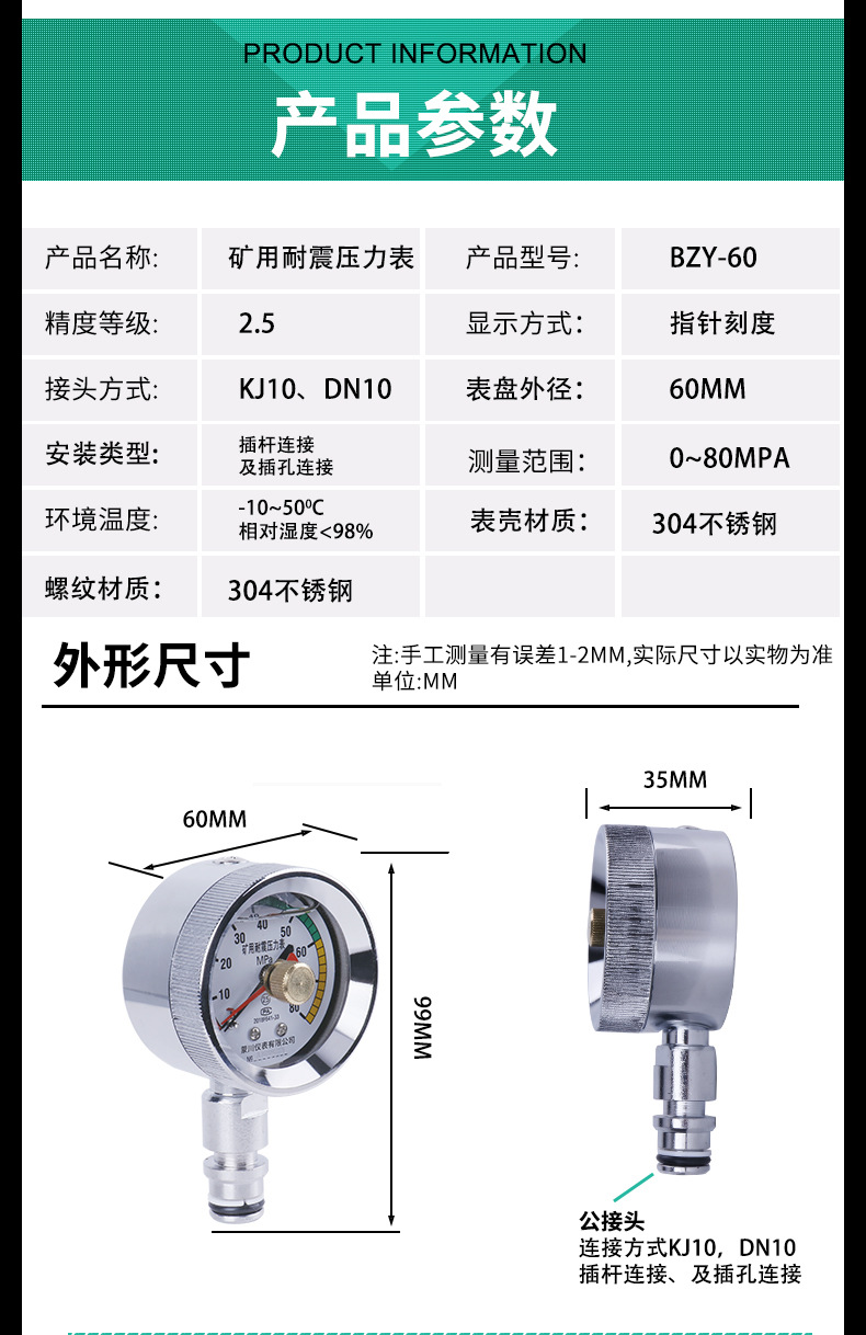 - What You Get: One MENGCHUAN BYZ60 mining pressure gauge, featuring a male connector and stainless steel casing, backed by a 2-year warranty and certified for quality and accuracy.