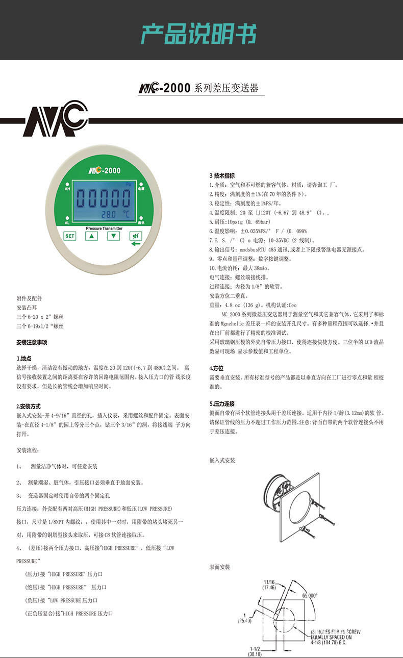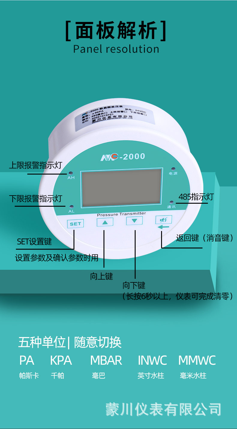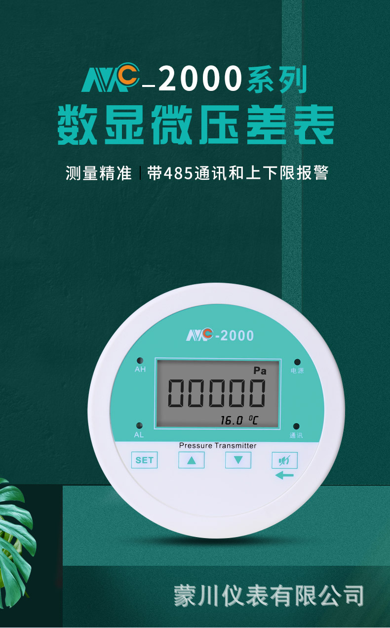 - Wide Compatibility: MENGCHUAN Instrument AVC-2000 series digital micro differential pressure transmitter, available in multiple ranges (e.g., 0-60Pa, 0-1000Pa, ±60Pa, ±1000Pa) with 485 communication, suitable for HVAC pressure measurement.