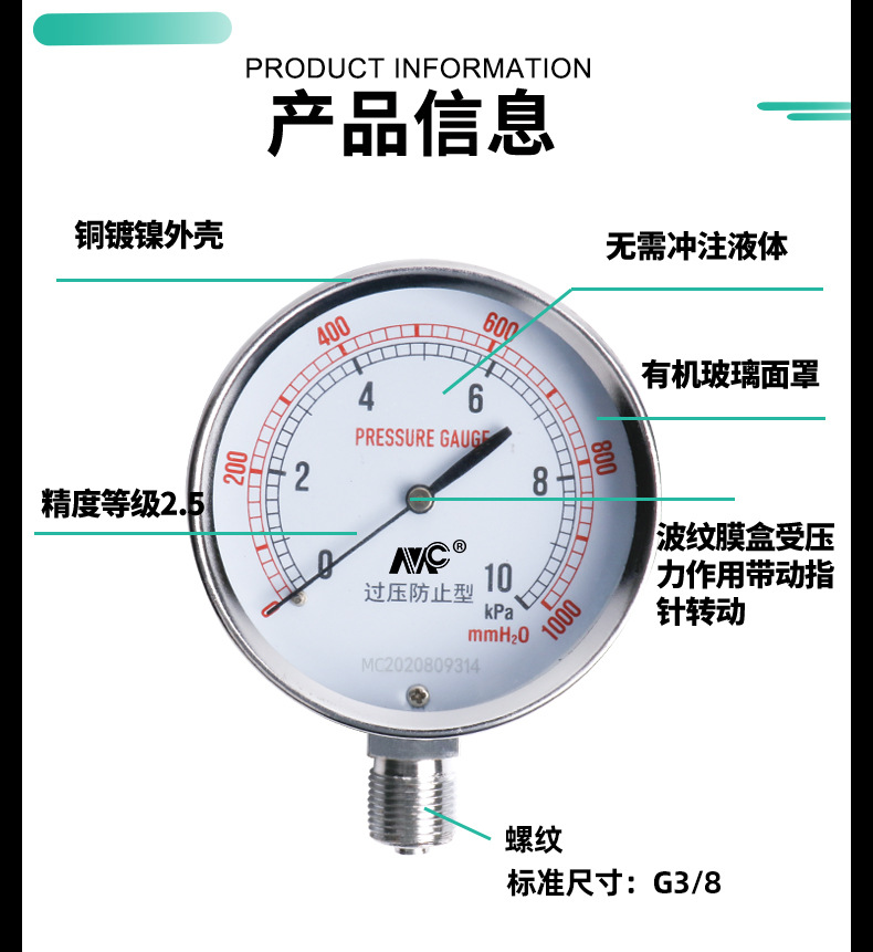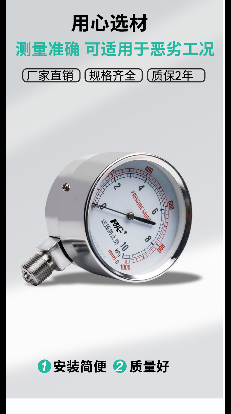 - Key Specs & Performance: Offers a 0-60kPa measurement range and radial dual scale (kPa & mmH2O) for precise readings, enabling accurate monitoring of pressure levels across a broad spectrum of pressures including -4 to 100kPa.