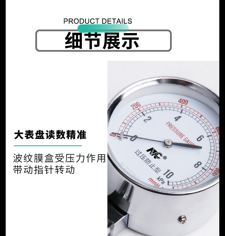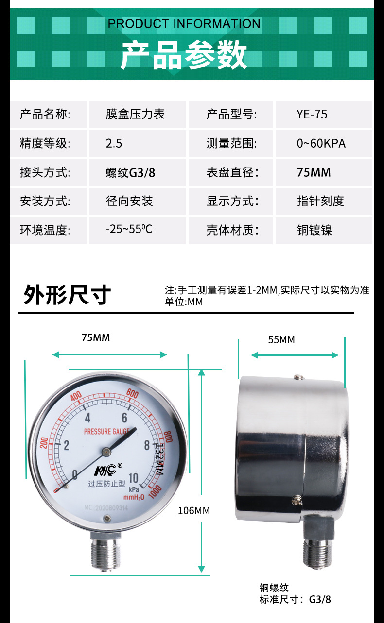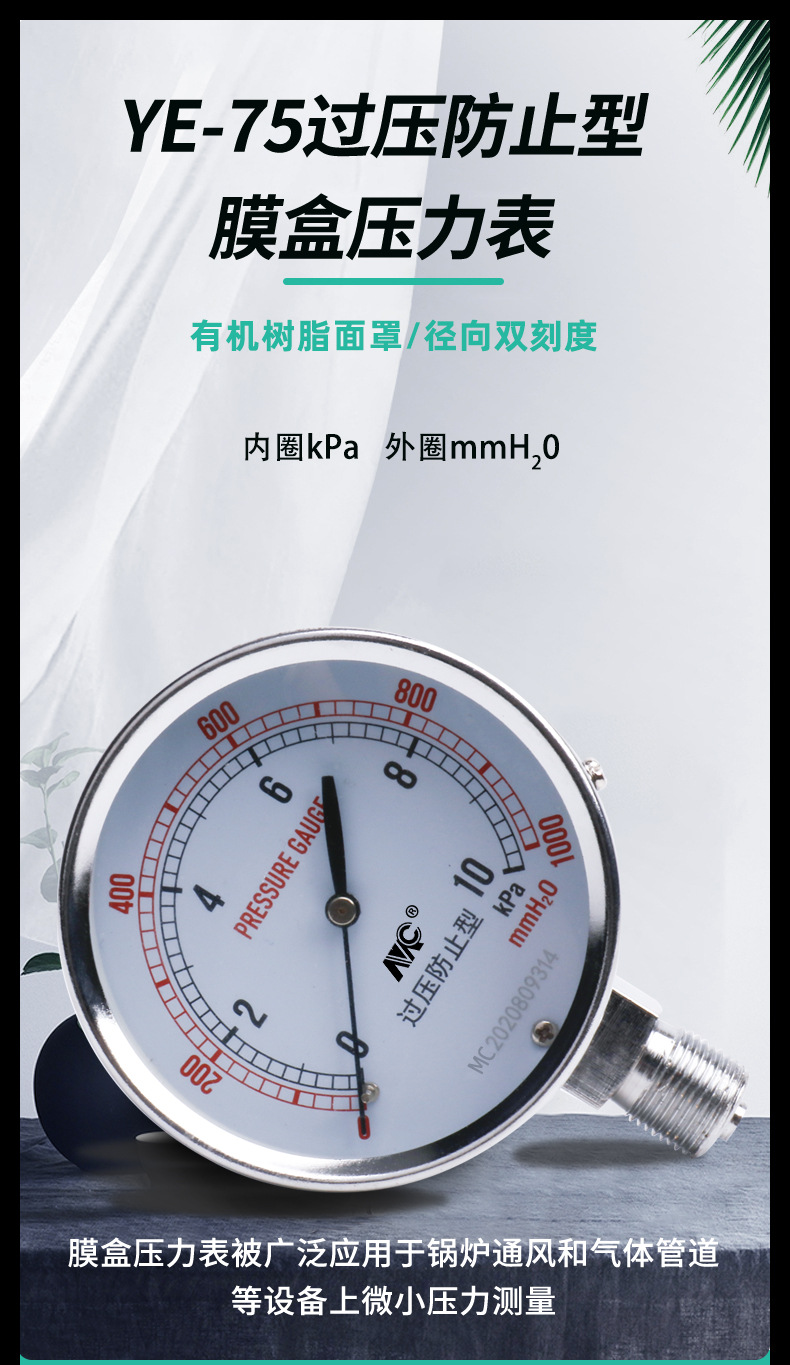 MENGCHUAN Instrument YE-75 Diaphragm Pressure Gauge 0-60kPa Overpressure Prevention Copper Head Radial Dual Scale for Water, Gas, Oil Pressure Systems