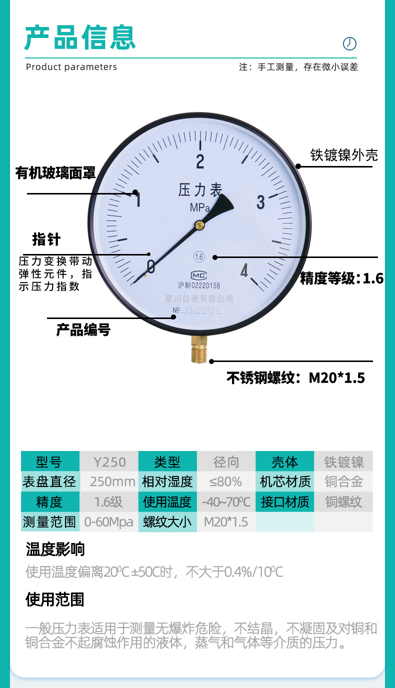- Wide Compatibility: Y250 general pressure gauge designed for various applications including water pressure, gas pressure, oil pressure, and HVAC systems.