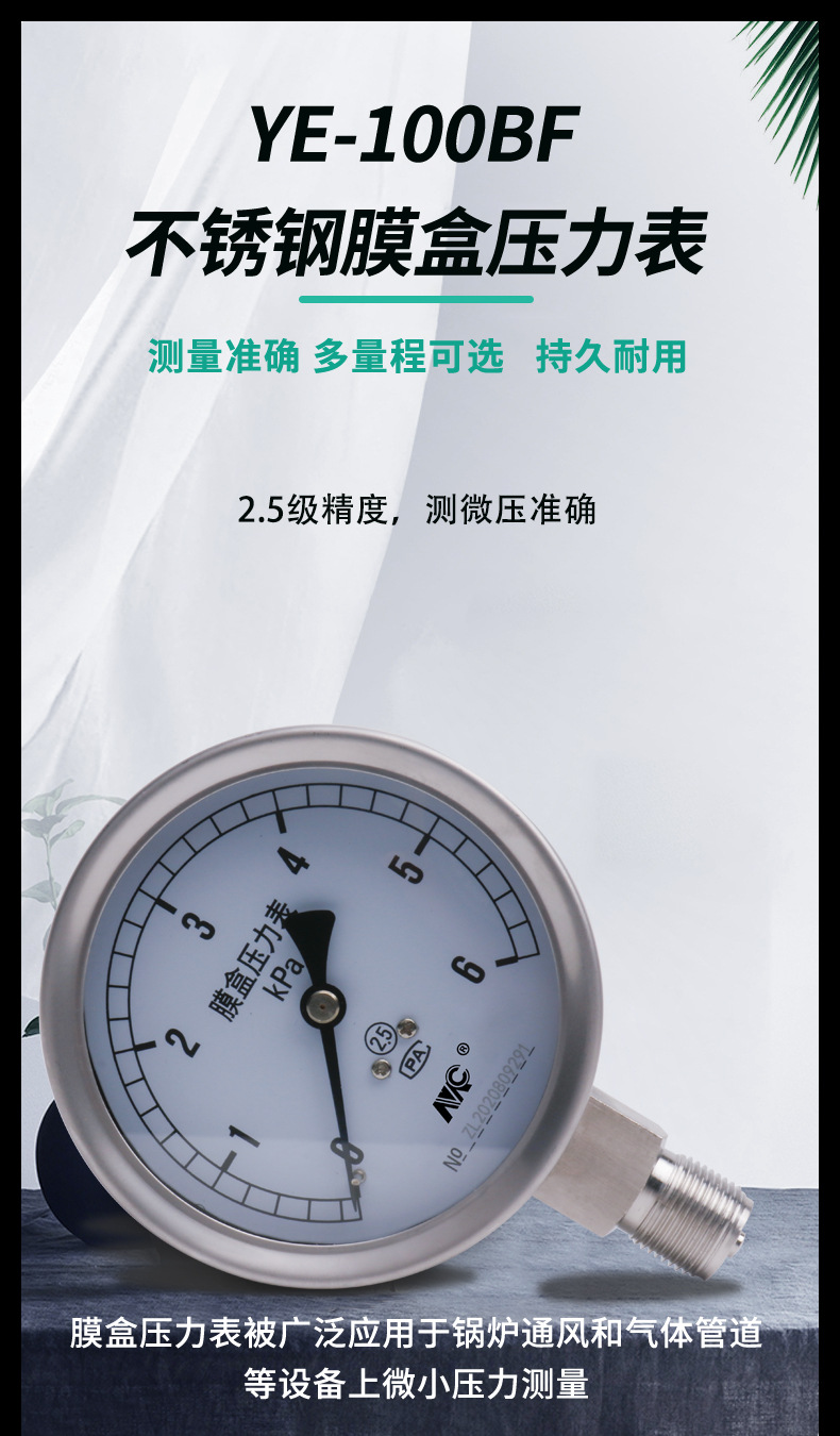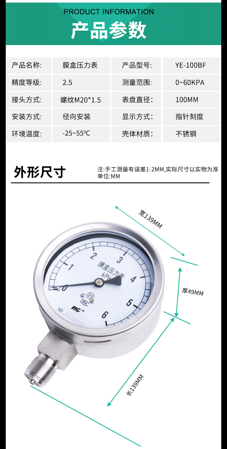 MENGCHUAN YE100BF Diaphragm Pressure Gauge (0-60kPa, Radial Connection) for Water, Air, Oil, Heating Pressure Testing & Mechanical Systems
