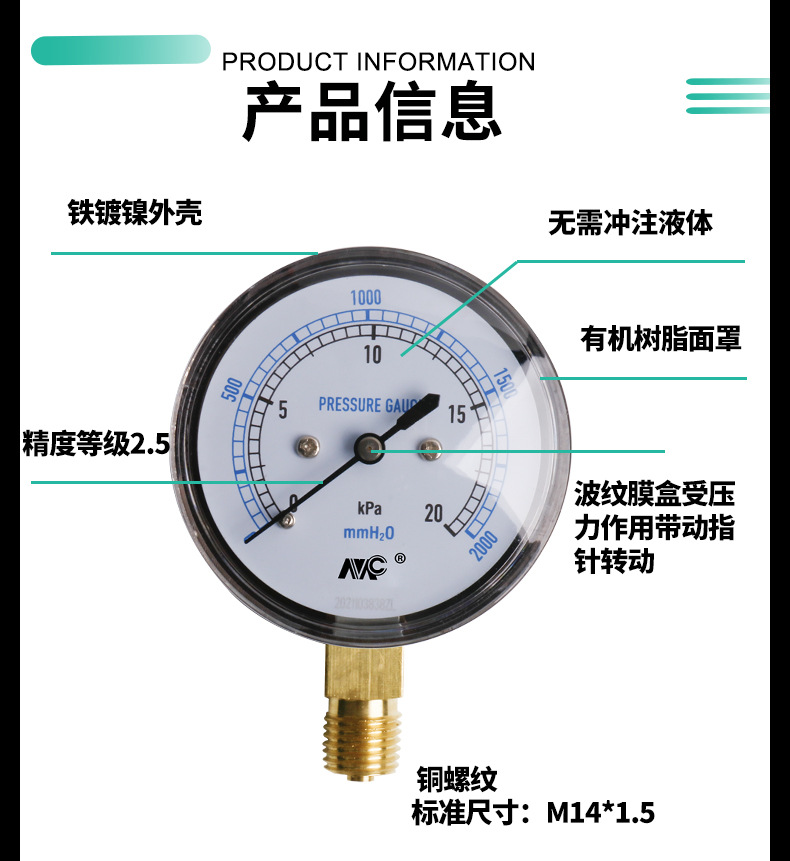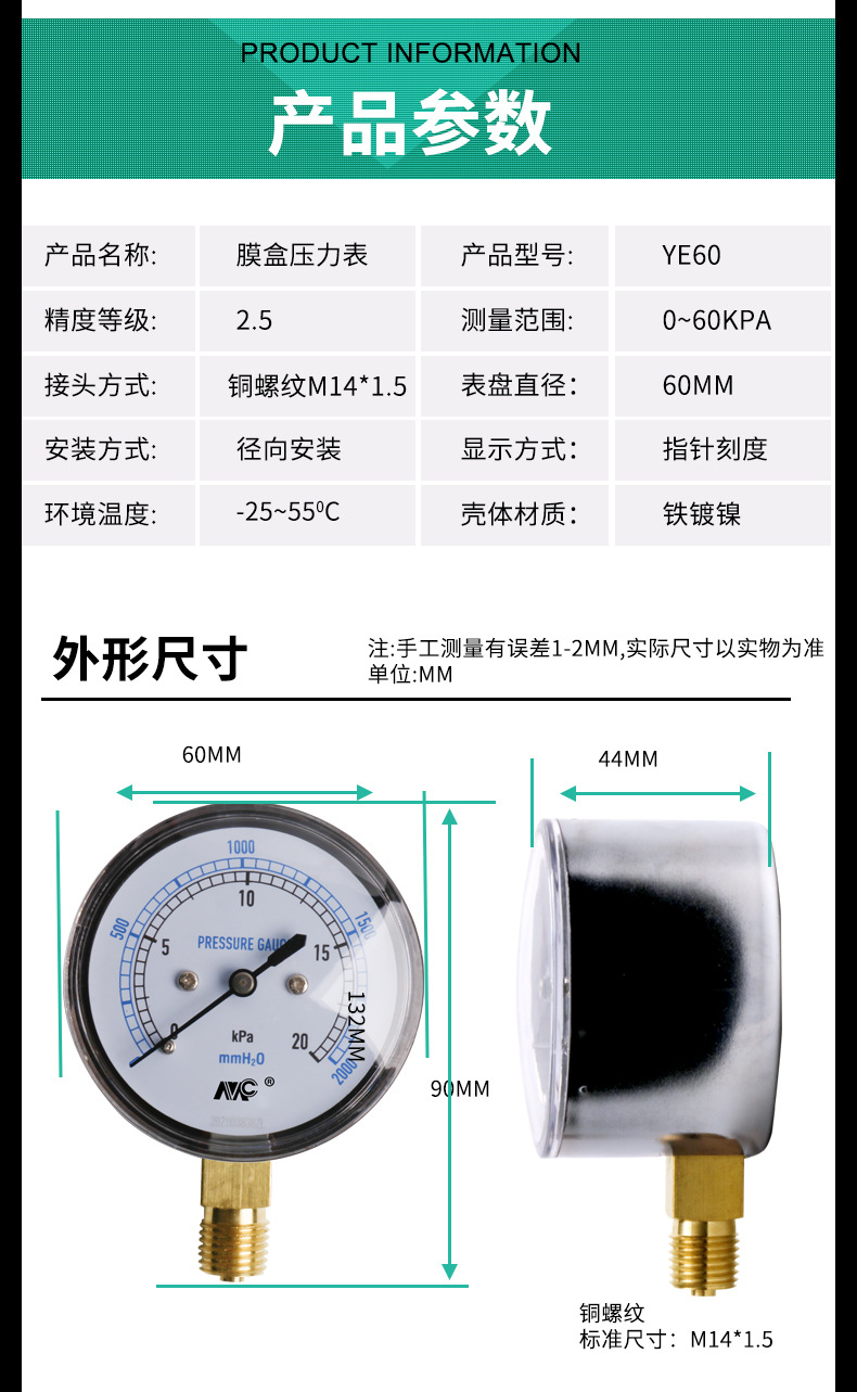 - Wide Compatibility: MENGCHUAN YE60 diaphragm pressure gauge suitable for various applications including water pressure, gas pressure, oil pressure, and mechanical systems.