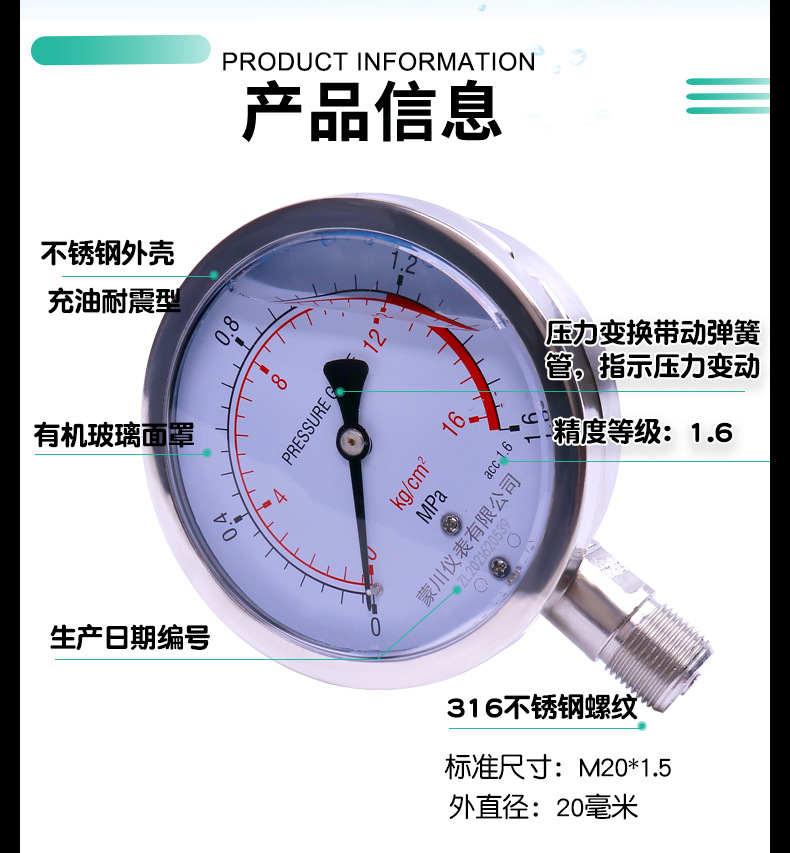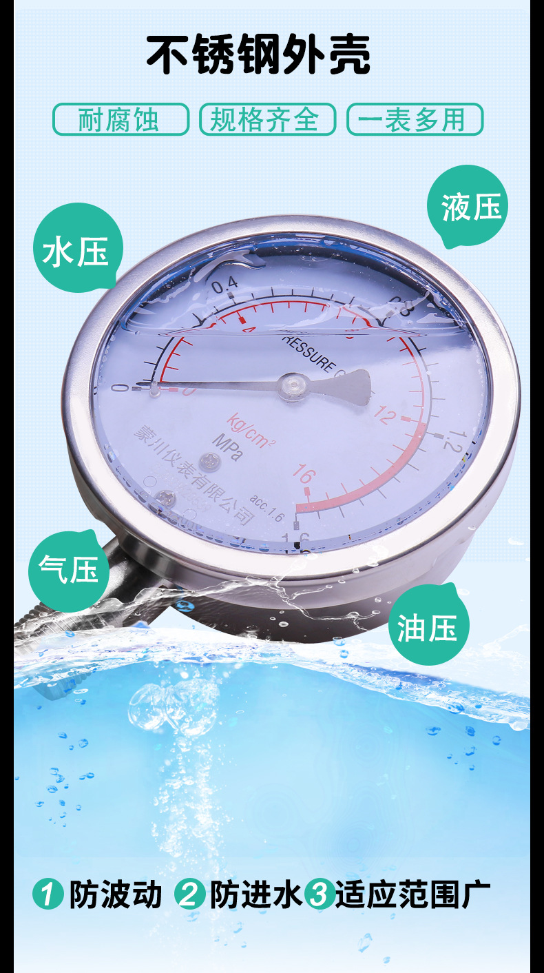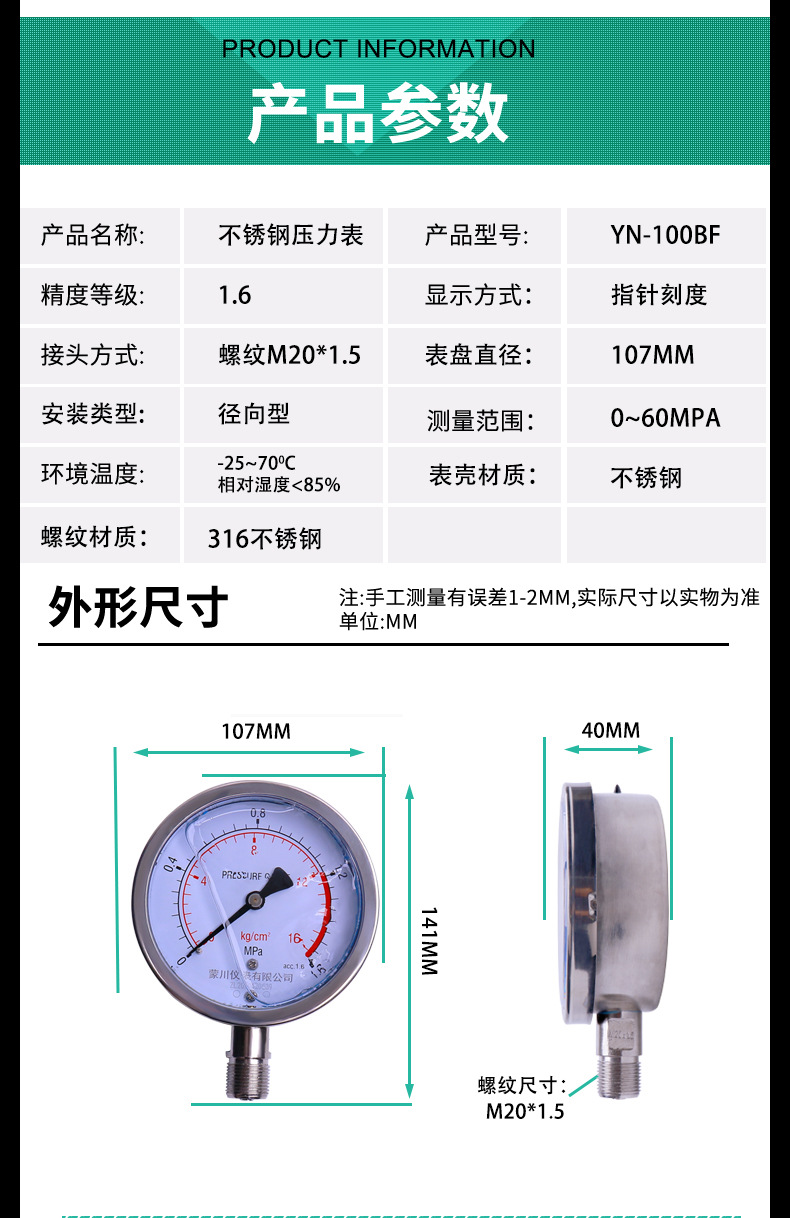 - Accurate & Reliable Performance: Features a 100mm nominal diameter, 0-60MPa measurement range, and 1.6 accuracy class for precise pressure readings. Designed for anti-vibration stability.