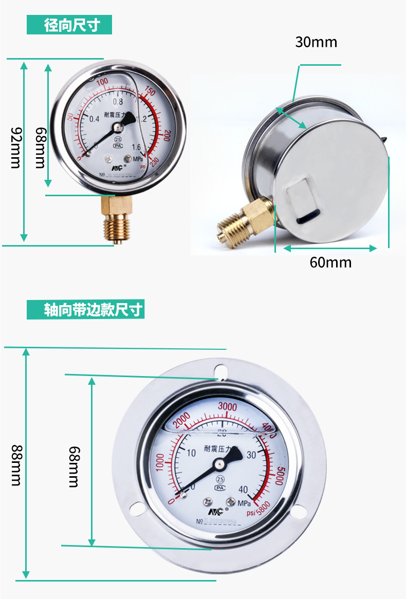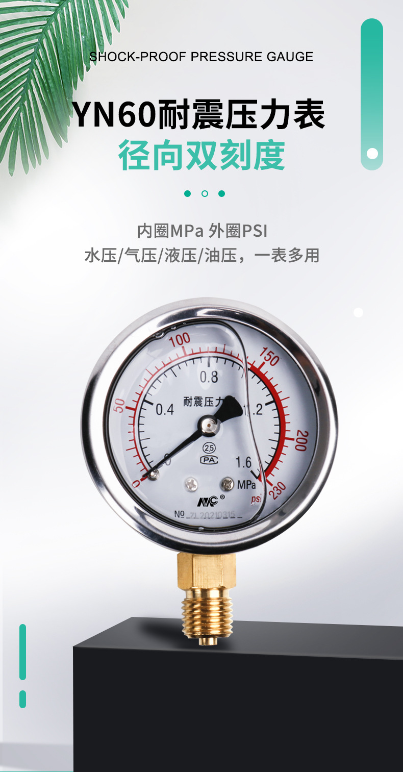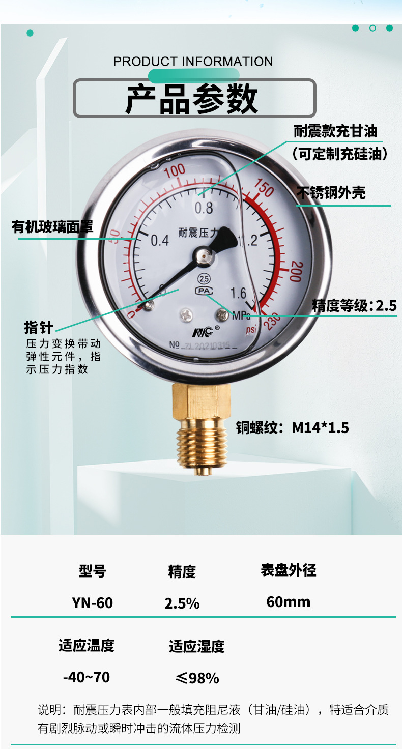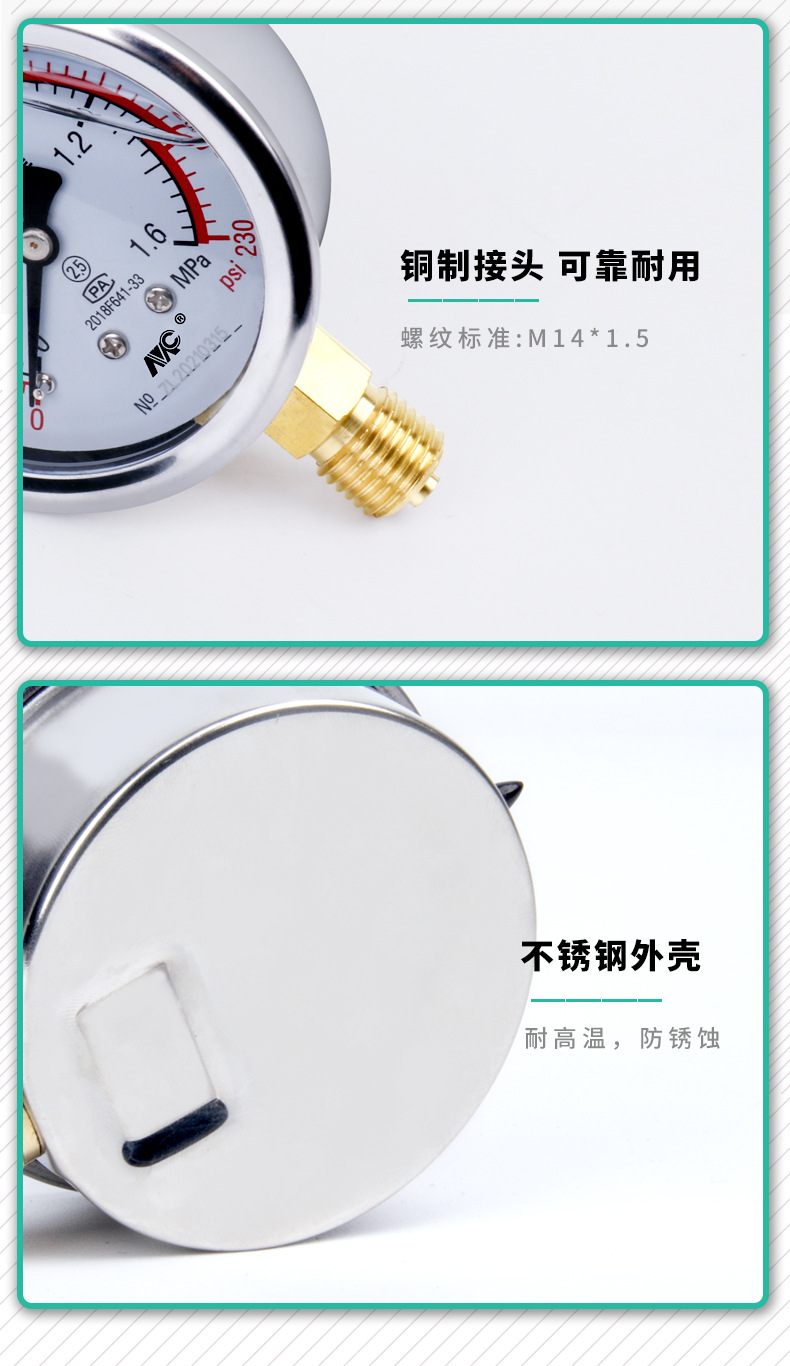MENGCHUAN YN60 Shock-Proof Pressure Gauge (0-1.6MPa, 0-2.5MPa, m14*1.5) for Water Pressure, Air Pressure, Oil Pressure and HVAC Systems