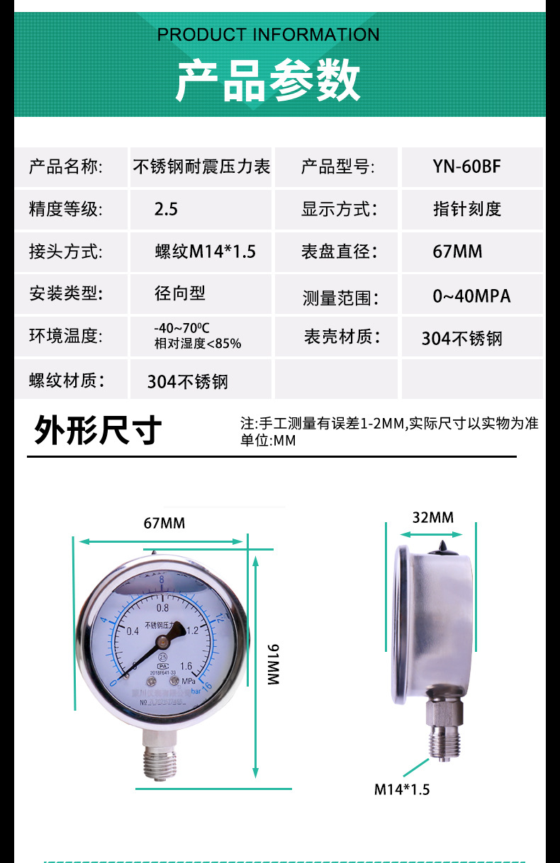 - What You Get: One YN60BF Stainless Steel Pressure Gauge, backed by a two-year warranty, CE and ISO9001 certifications, and a calibration certificate for assured quality.