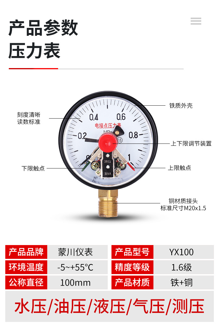 - Wide Compatibility: MENGCHUAN YX100 electric contact pressure gauge suitable for diverse applications including water, gas, oil pressure, and floor heating systems.