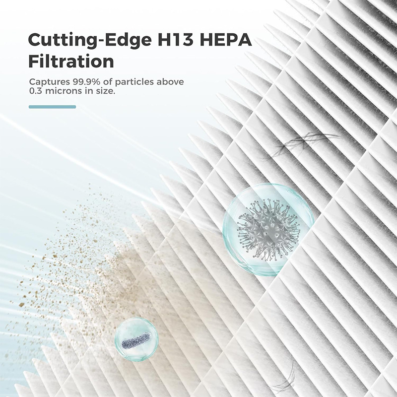 - Advanced Filtration Performance: Captures 99.97% of airborne particles as small as 0.3 microns, including dust, pollen, pet dander, and smoke, meeting US EPA certification standards.