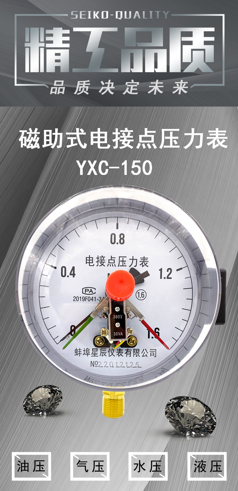 - Wide Compatibility: YXC-150 series magnetic electric contact pressure gauge is universally compatible with water, gas, oil, and hydraulic pressure systems, offering versatile application.