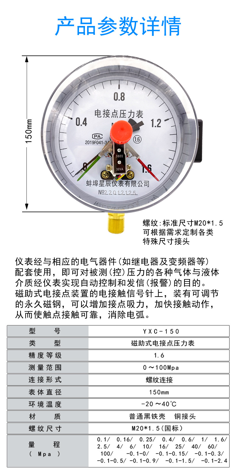 Magnetic Electric Contact Pressure Gauge YXC-150 Series (0-1.6MPa, 380V 30VA) for Water, Gas, Oil, Hydraulic Systems