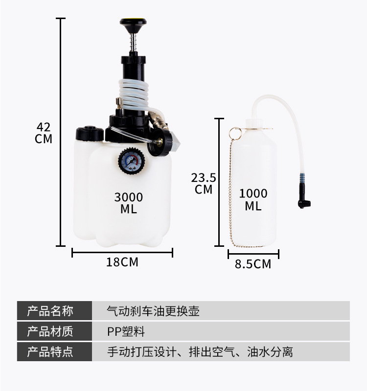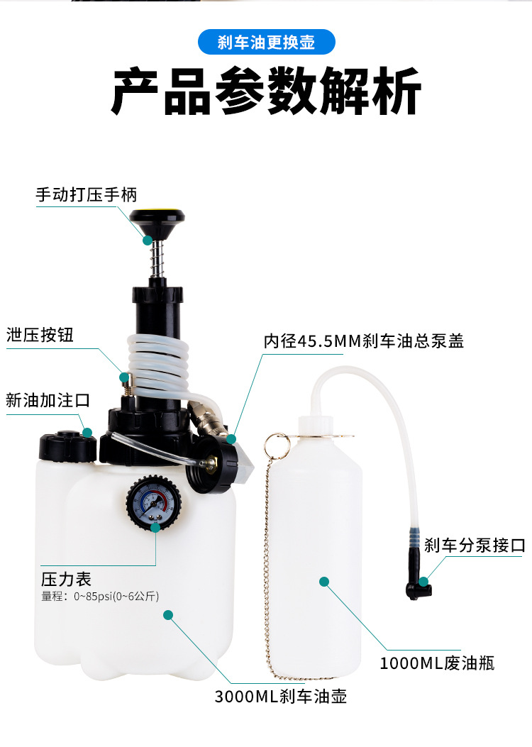 - Key Specs & Performance: Features a 3000ml brake fluid reservoir, a 1000ml waste oil bottle, and an integrated pressure gauge ranging from 0-85 PSI (0-6 kg), ensuring efficient and clean brake fluid exchange.