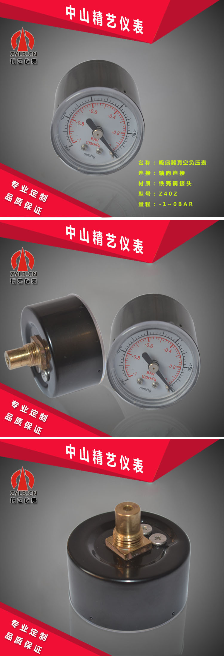 Medical Pressure Gauge Vacuum Meter Z-40Z Axial Connection 40mm Diameter -0.1~0 MPa 2.5 Accuracy for Suction Apparatus