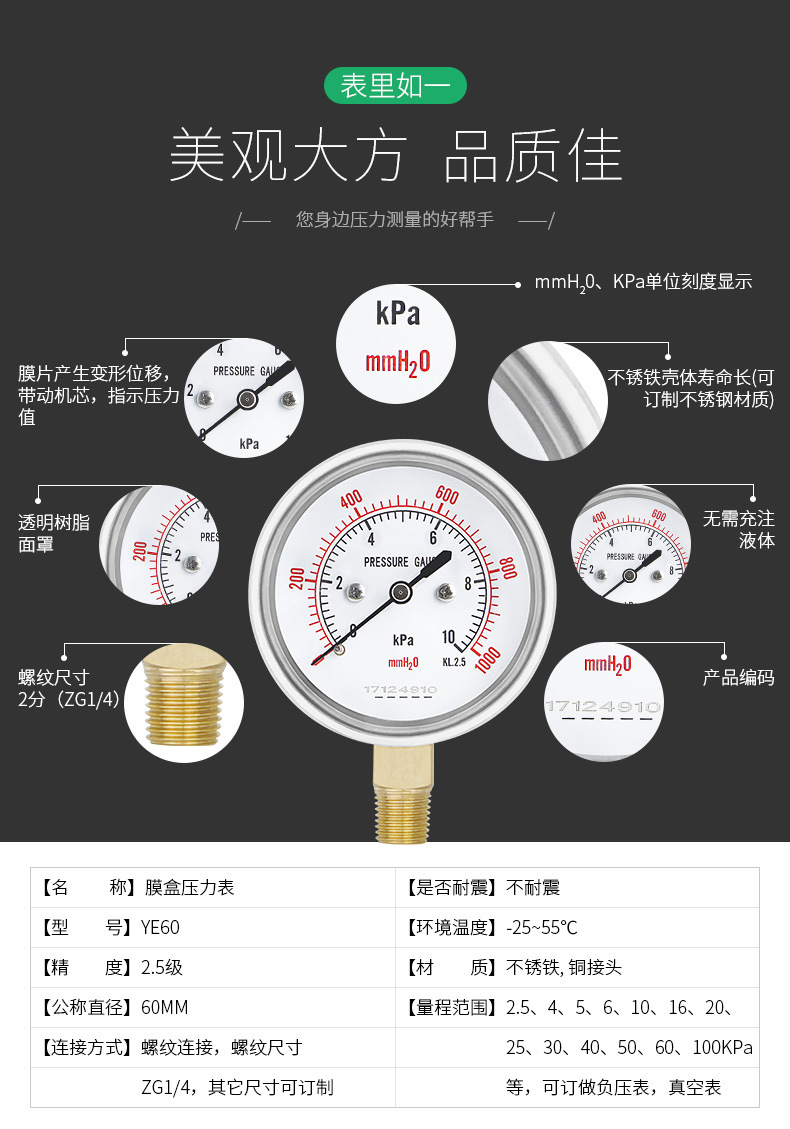 - Wide Compatibility: Designed as a YE60 membrane box pressure gauge, suitable for various industrial and residential applications, especially for natural gas pressure measurement with a wide range of specifications.