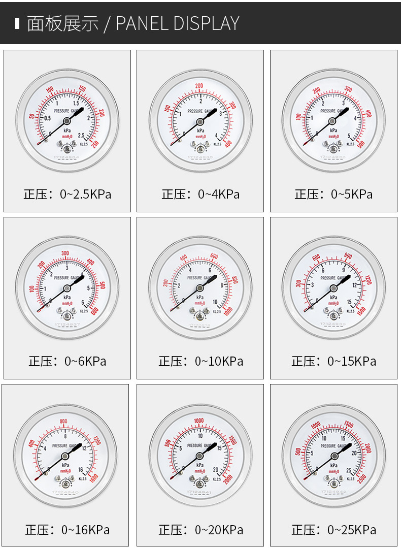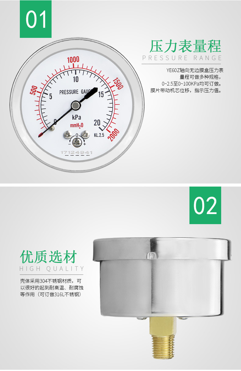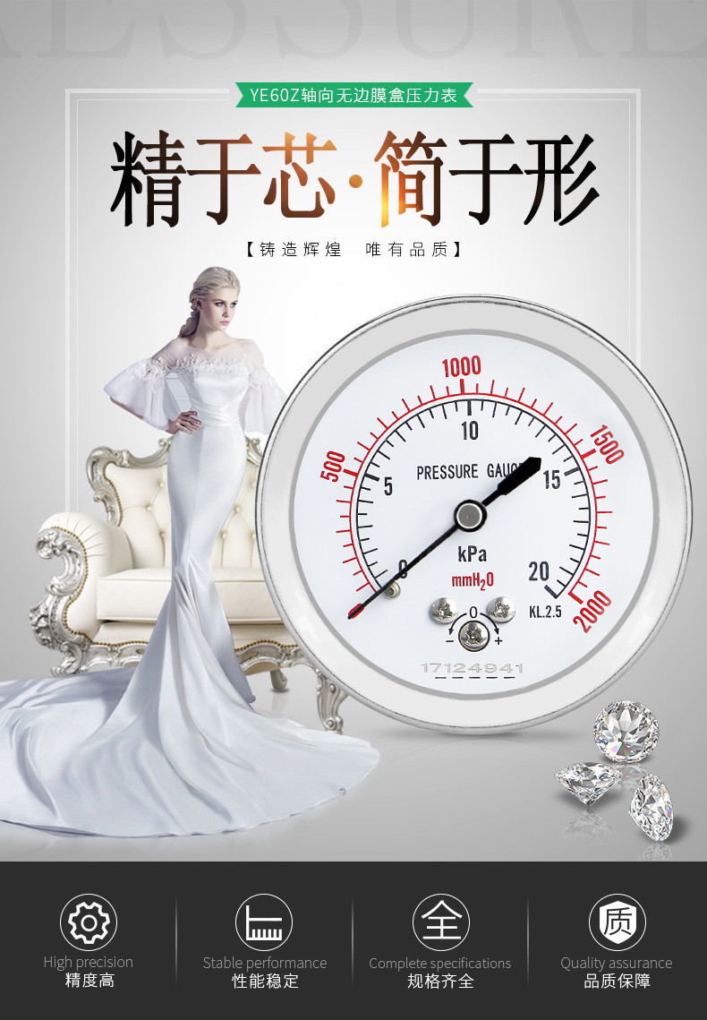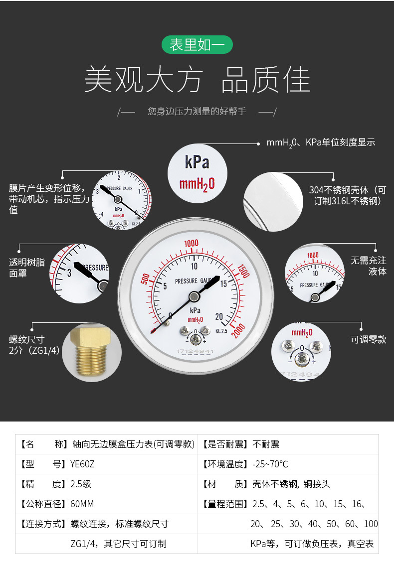 - Key Specifications: Features a 60mm nominal diameter, axial bezel-less design, and a measurement range of -100~0~100KPa, ensuring precise readings for various applications.