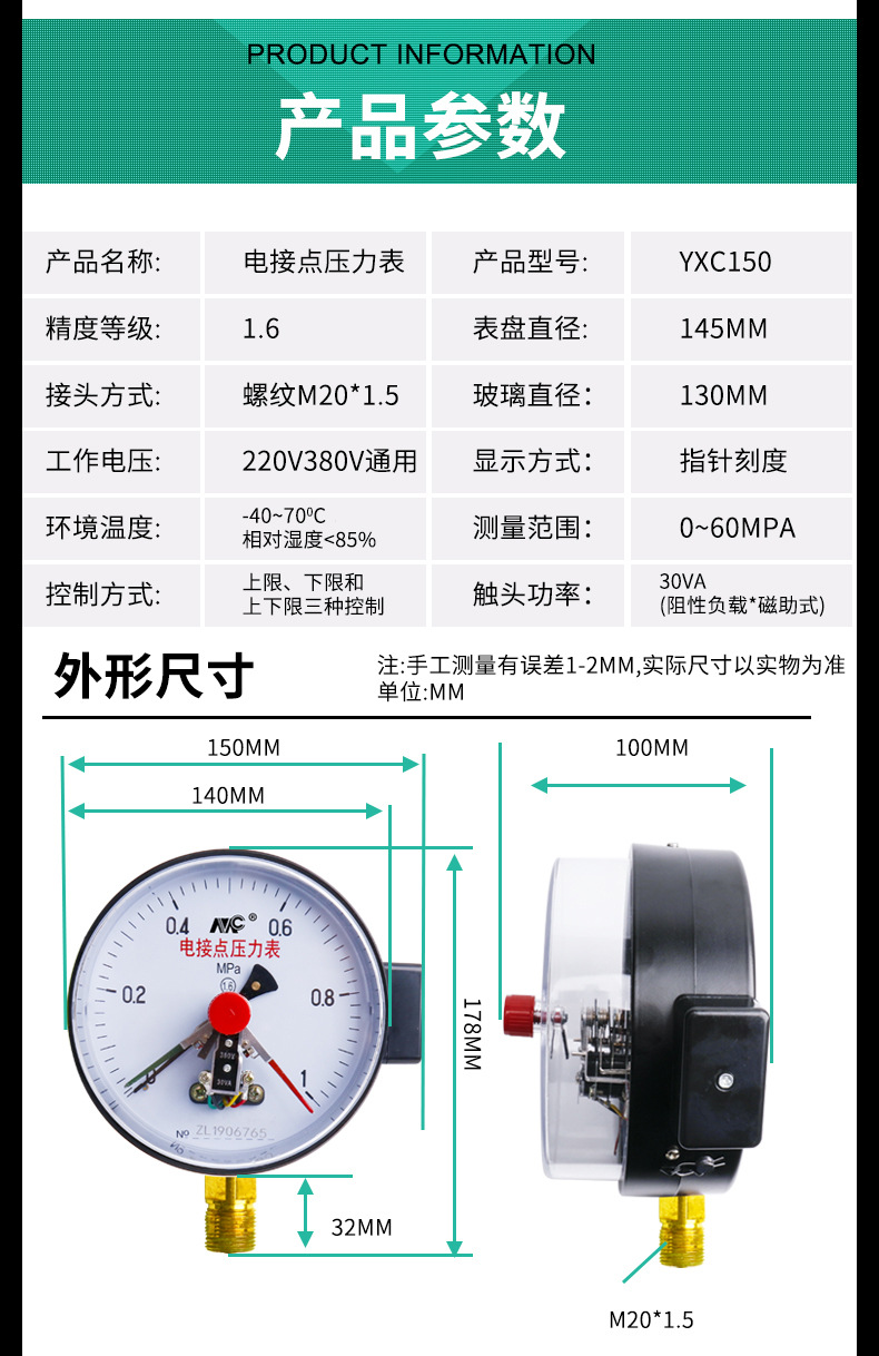 - What You Get: Includes one YXC150 electric contact pressure gauge, backed by a two-year warranty, ISO9001 quality certification, and CE certification for peace of mind.