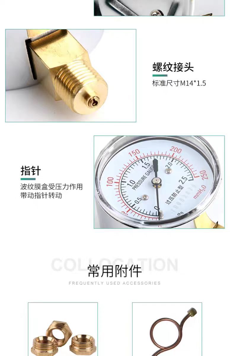 - Wide Compatibility: YE-60 micro pressure gauge suitable for measuring pressure of water, oil, and gas, offering versatile application across various systems.