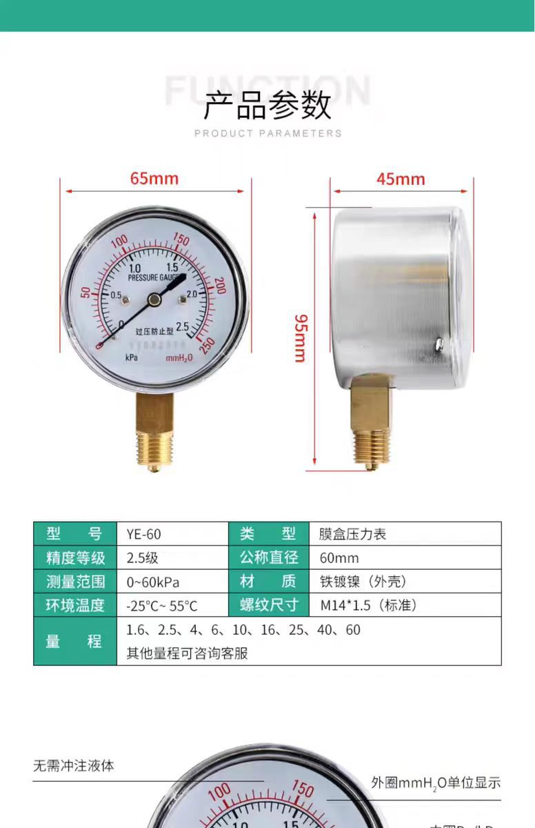 - What You Get: One high-quality YE-60 micro pressure gauge, offering exceptional accuracy and durability for diverse pressure measurement needs. Customizable specifications available.